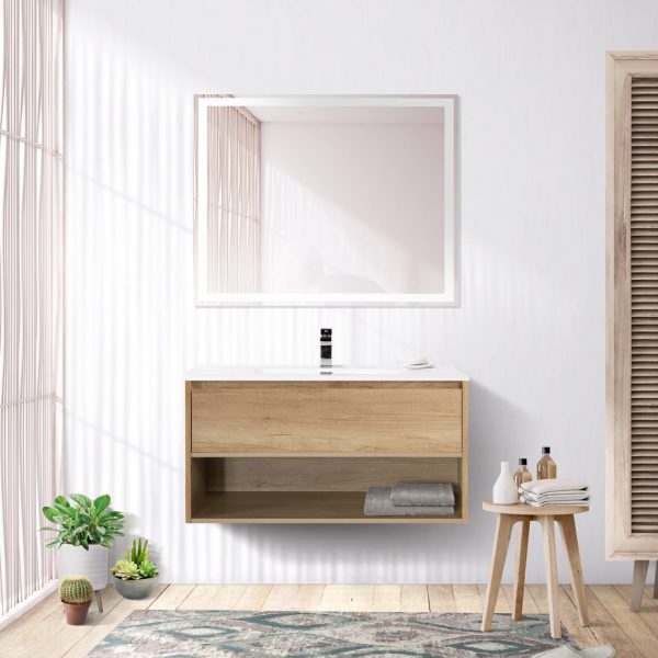 BelBagno — Тумба c раковиной подвесная с одним ящиком и одной открытой полкой KRAFT 100 Rovere Nebrasca Nature, раковина белая