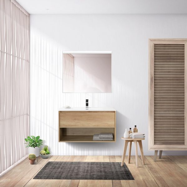 BelBagno — Тумба c раковиной подвесная с одним ящиком и одной открытой полкой KRAFT 80 Rovere Nebrasca Nature, раковина белая