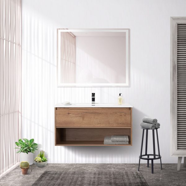 BelBagno — Тумба c раковиной подвесная с одним ящиком и одной открытой полкой KRAFT 100 Rovere Tabacco, раковина белая