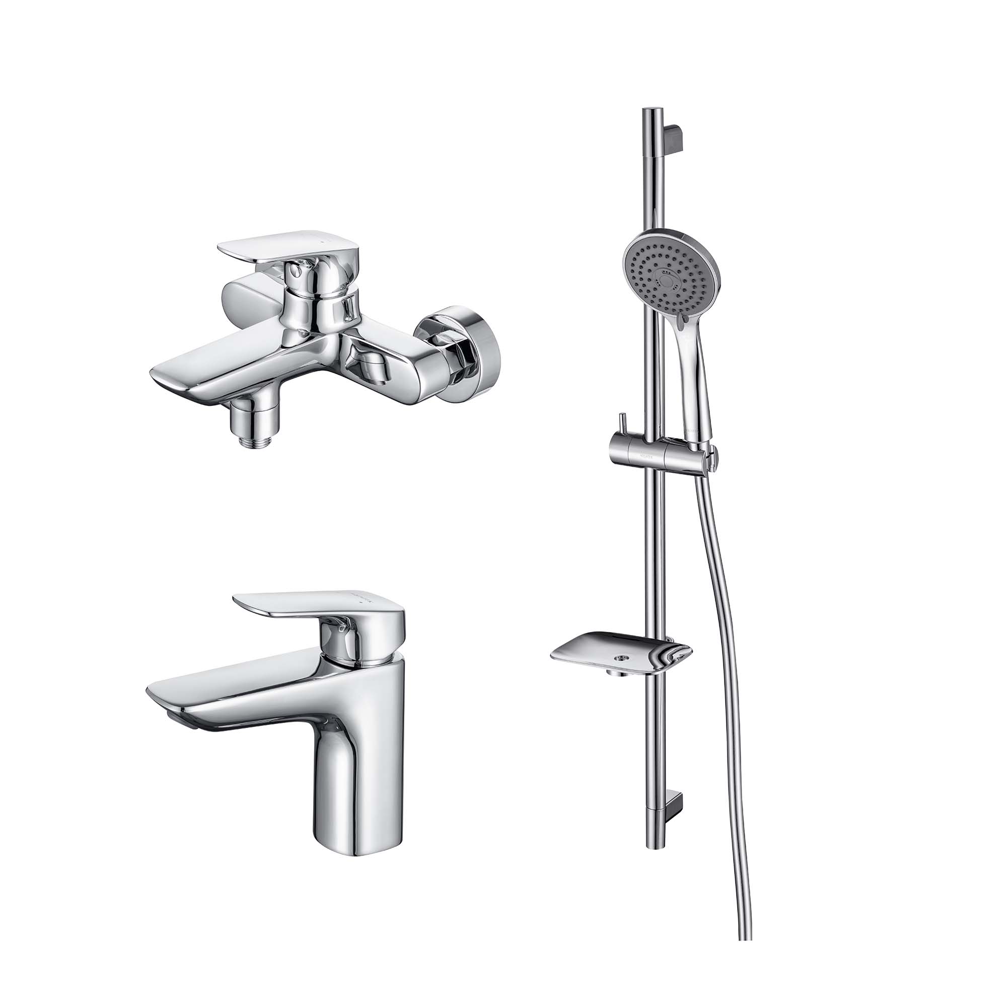 В комплекте: душевая штанга; держатель душевой лейки; душевая лейка; душевой шланг из ПВХ; мыльница; монтажный комплект