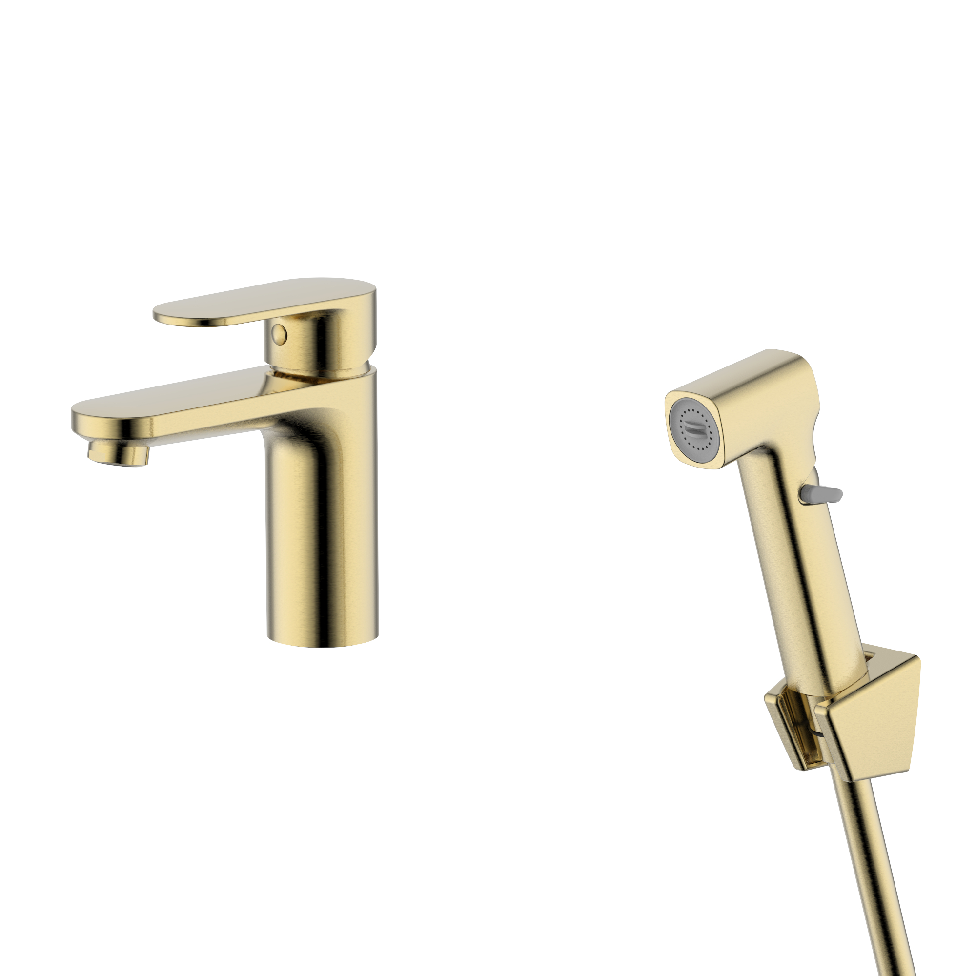 Акватек — Смеситель для раковины 90 без донного клапана с гигиеническим ручным душем Ника AQ1812BG, золото