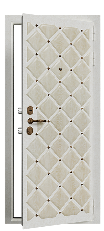 Металлический эксцентрик, противосъемные ригели, петли на опорном подшипнике с нержавеющим штоком гарантируют высокую калибровку закрывания двери, работу замков и взломостойкость. Использование дополнительного листа стали толщиной 0,8 мм под внутренней панелью усиливает надежность и безопасность входных дверей ГРАФ.