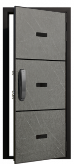 Дверное полотно толщиной 90 мм, усилено стальным листом 0,8 мм и навешено на разнесенные итальянские петли для сверхтяжелых дверей с функцией регулировки по высоте с защитой от провисания. Защиту от сквозняков и шума гарантируют уплотнители. Два гиба объемного цельногнутого короба 130 мм толщиной придадут жёсткость конструкции и устойчивость к силовым нагрузкам. Тепло/-шумозащиту обеспечивают изоляционная плита Роклайт, Виброизол, пробковый слой коры дуба плотной структуры. Перед покраской, для защиты от коррозии, двери покрываются полиэфирным цинкогрунтом.