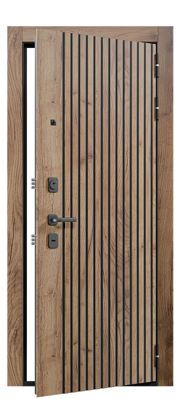 Новый широкий компланарный наличник (90 мм) завершает современный образ двери. Его можно оформить в цвет реек, либо в цвет основания панели.