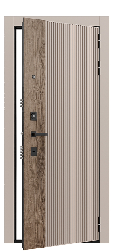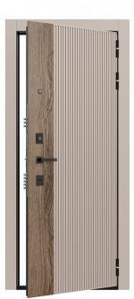 Широкий компланарный наличник (90 мм) завершает современный образ двери. Его можно оформить в цвет реек, либо в цвет основания панели.