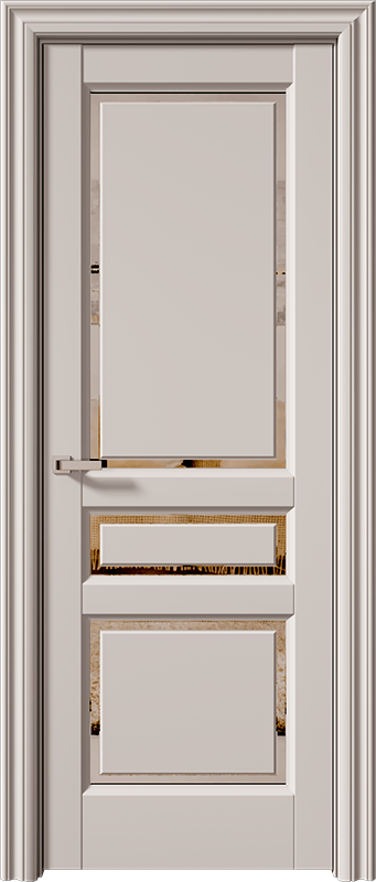 Двери Равенна — классические и в то же время современные. Оригинальный вид формируют вставки из зеркала графит с фацетной обработкой, которые окантовывают полотна дверей на стыке стоевых и филенок. Равенна — серия дверей выполненных по сборочной технологии, с фрезерованными стоевыми, поперечными и филенками. Изготавливаются ПВХ-покрытиями, патиной не декорируются. Толщина полотна 40 мм.