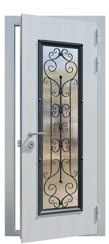 Стеклопакет с декоративным кованым элементом не только повышает визуальную привлекательность двери, но и сохраняет тепло внутри помещения. Двухкамерный стеклопакет обеспечивает широкий обзор пространства за дверью и светопропускную способность.