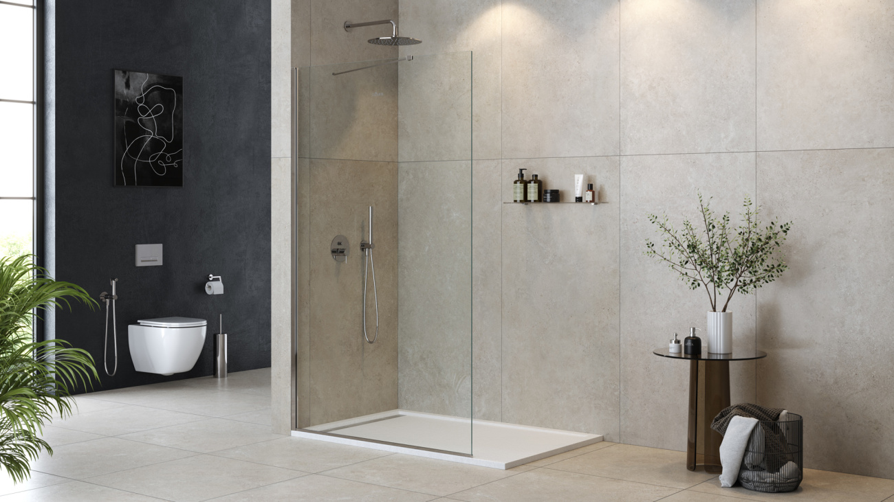 Уникальное решение для защиты ванной комнаты от брызг. Бескаркасное стекло душевой перегородки walk-in расширяет пространство и добавляет ему элегантности. Душевые