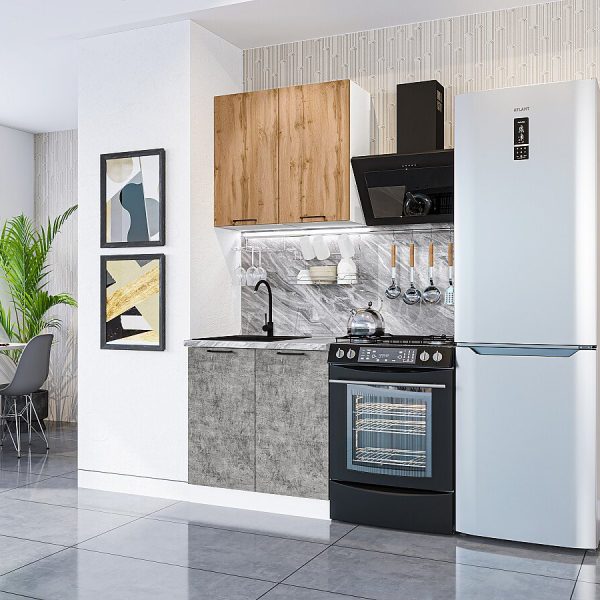 Характеристики кухни Размер (В*Ш*Г), мм2140*800*600 Цвет каркасовБелый Материал каркасовЛДСП Цвет фасадовWotan Oak 2S/Temple Stone 2S Материал фасадовЛДСП Толщина кромки, мм1