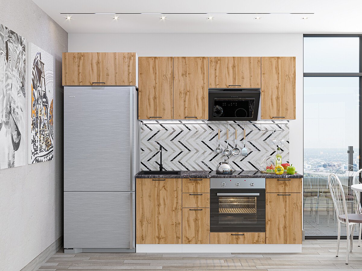 Характеристики кухни Размер (В*Ш*Г), мм2140*800*600 Цвет каркасовБелый Материал каркасовЛДСП Цвет фасадовWotan Oak 2S/Temple Stone 2S Материал фасадовЛДСП Толщина кромки, мм1