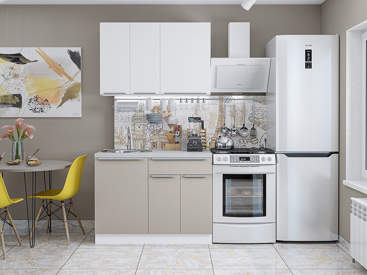 Характеристики кухни Размер (В*Ш*Г), мм2140*1200*600 Цвет каркасовБелый Материал каркасовЛДСП Цвет фасадовКашемир Материал фасадовМДФ Отделка фасадовПленка ПВХ. Полезная информацияВнимание! Ручка в
