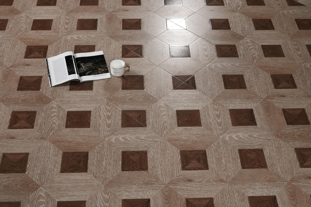 Декор доски выполнен с сочетанием светлых и темных коричневых тонов в стиле «художественный паркет». Подобный рисунок позволяет реализовать индивидуальный дизайн интерьера и часто применяется для оформления гостиных, кабинетов и даже кухонных зон.