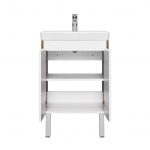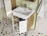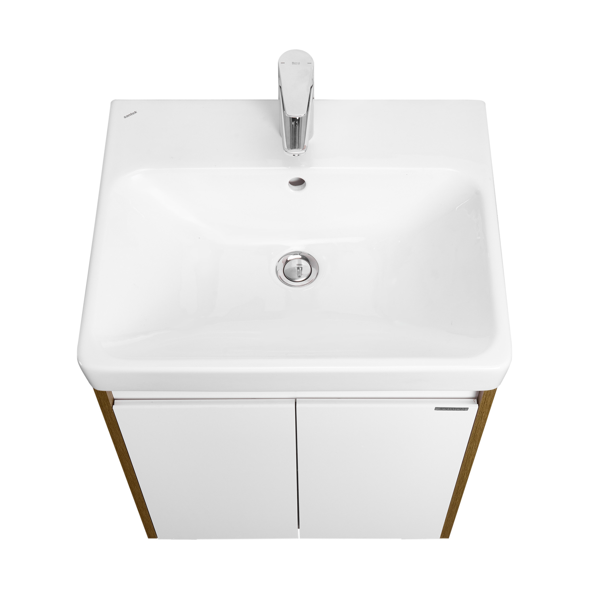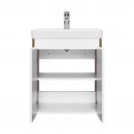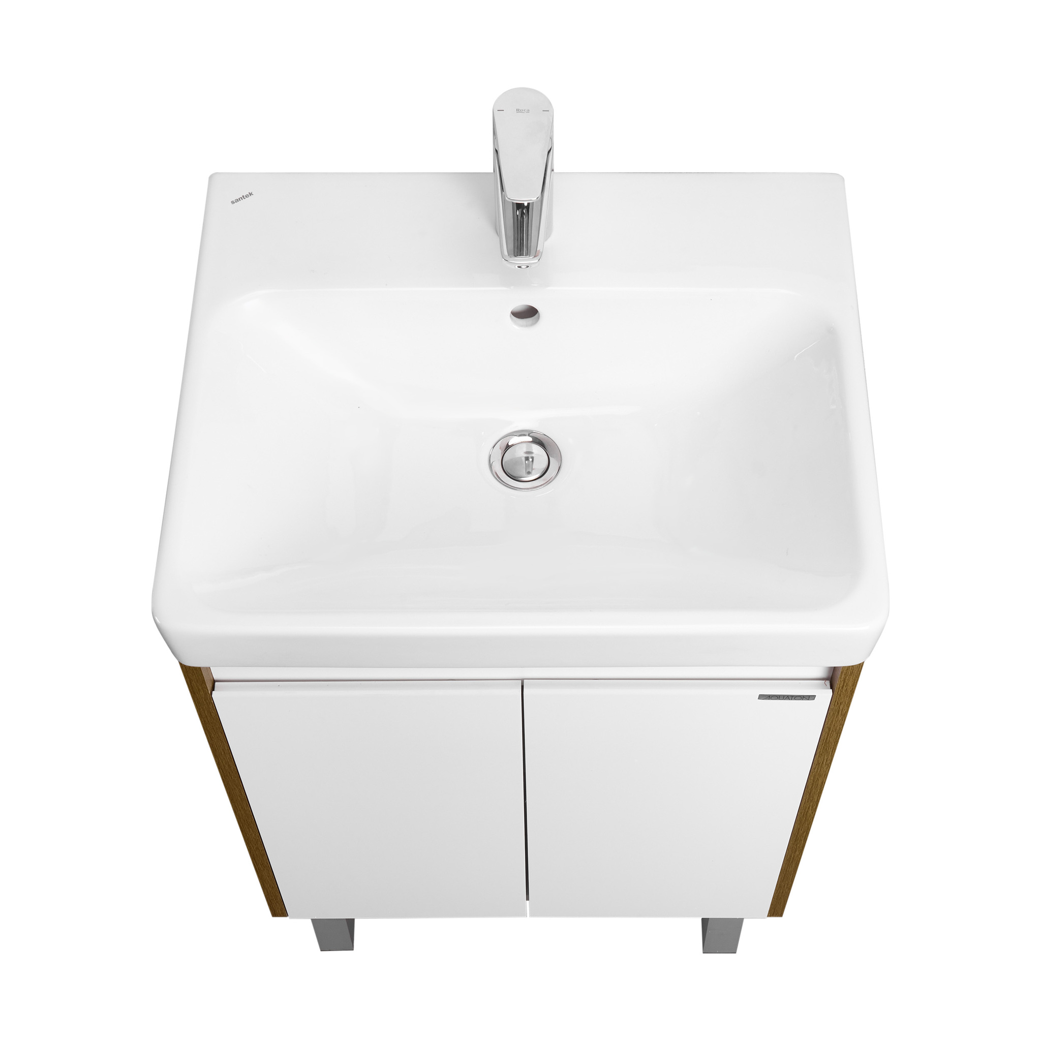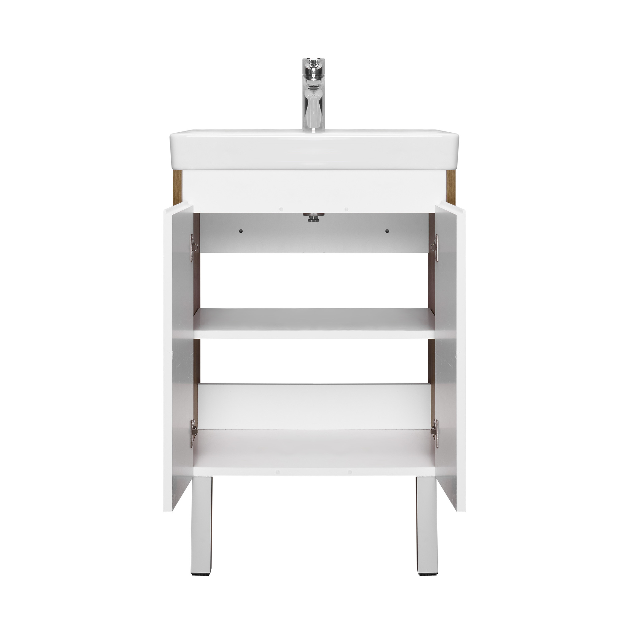 Тумба Сканди Doors 55 выполнена в популярном минималистичном скандинавском стиле. Корпус тумбы выполнен из влагостойкой ЛДСП в декоре натурального дерева, а фасады-створки в белой глянцевой покраске. За створками скрывается вместительное пространство, разделенное на две части регулируемой по высоте полкой из ВЛДСП. На тумбе нет выступающих деталей и фурнитуры, открытие створок реализуется за фасад, верхняя часть которого обработана под ручку J-профиль. К тумбе идеально подходит белоснежная раковина Адриана от бренда Santek. Раковина продается отдельно.