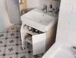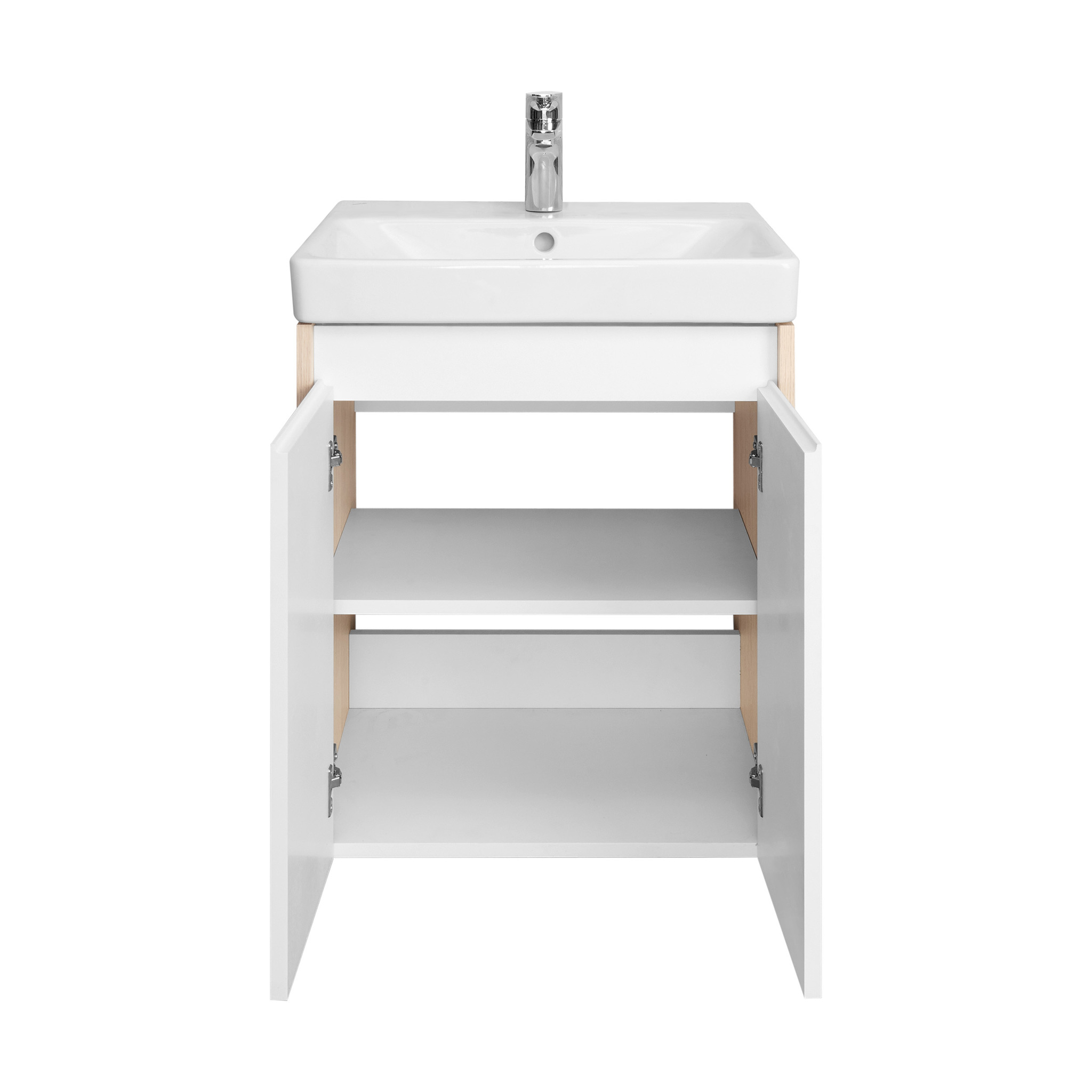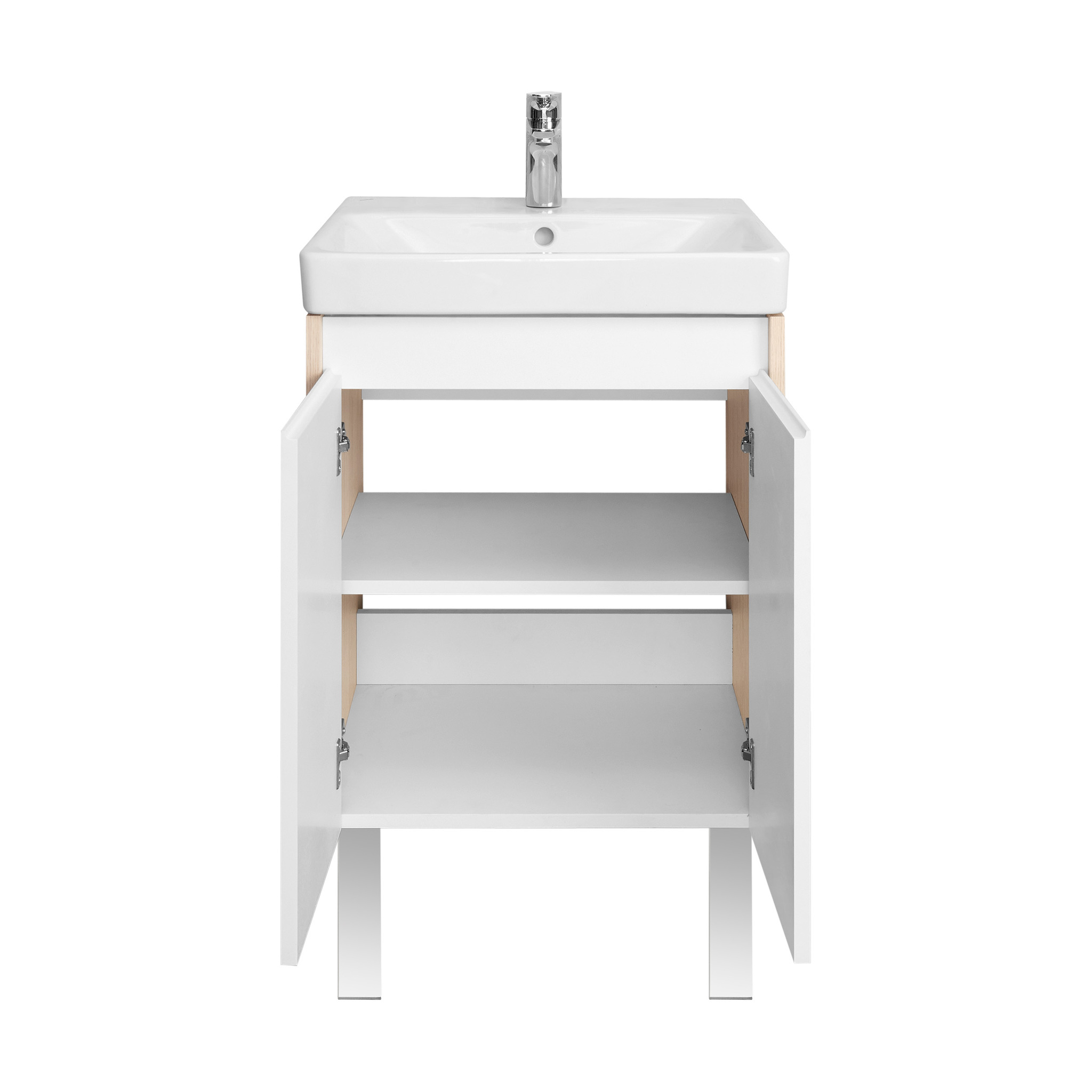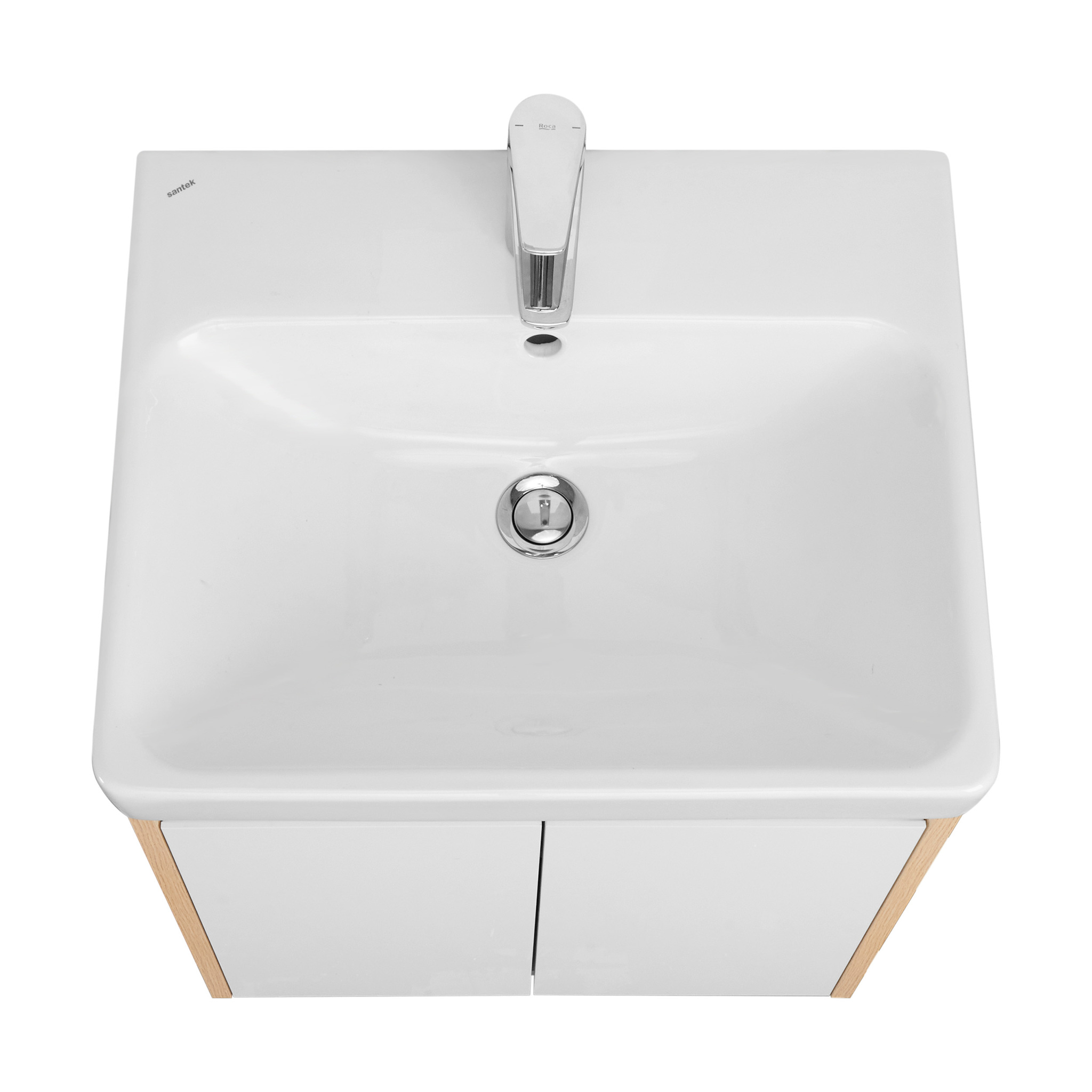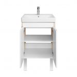Тумба Сканди Doors 55 выполнена в популярном минималистичном скандинавском стиле. Корпус тумбы выполнен из влагостойкой ЛДСП в декоре натурального дерева, а фасады-створки в белой глянцевой покраске. За створками скрывается вместительное пространство, разделенное на две части регулируемой по высоте полкой из ВЛДСП. На тумбе нет выступающих деталей и фурнитуры, открытие створок реализуется за фасад, верхняя часть которого обработана под ручку J-профиль. К тумбе идеально подходит белоснежная раковина Адриана от бренда Santek. Раковина продается отдельно.