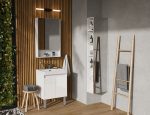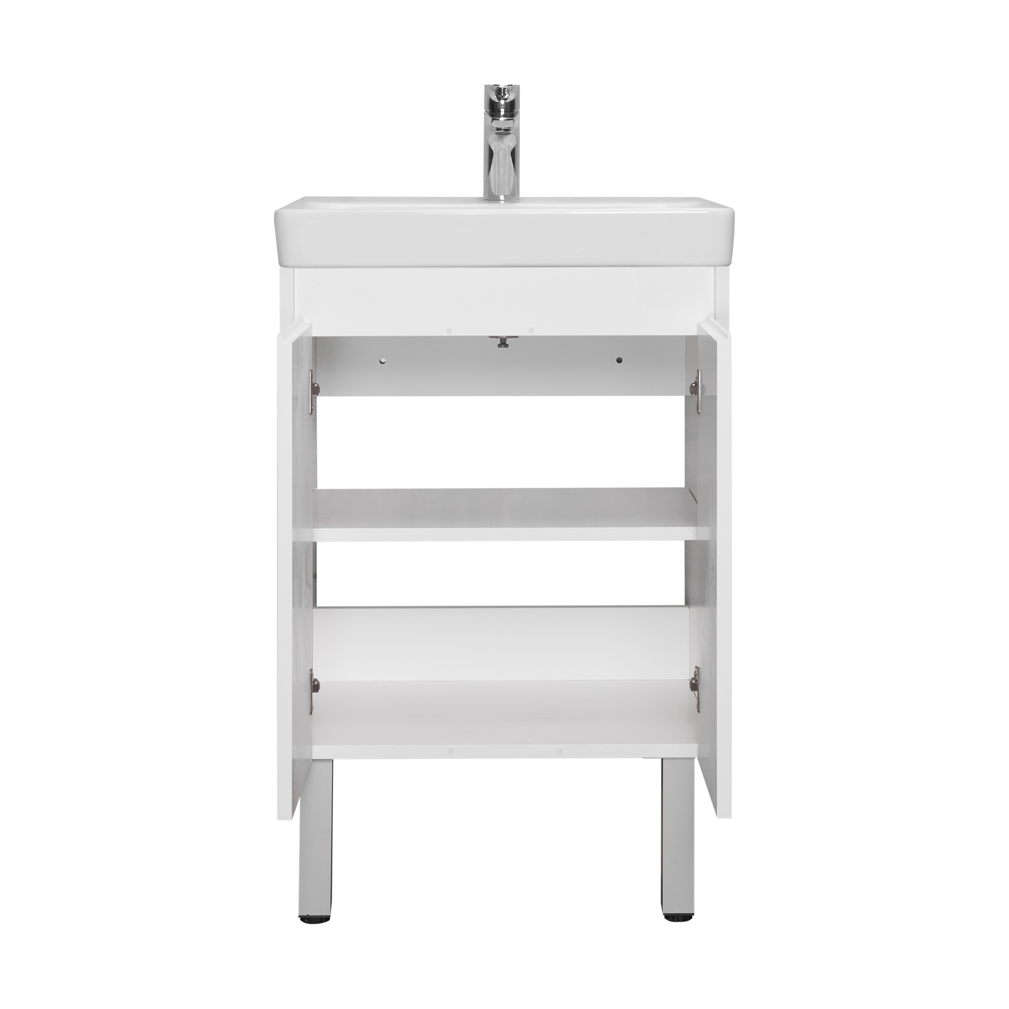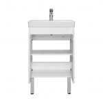 Тумба Сканди Doors 55 выполнена в популярном минималистичном скандинавском стиле. Корпус тумбы выполнен из влагостойкой ЛДСП в белой матовой покраске, а фасады-створки в белой глянцевой покраске. За створками скрывается вместительное пространство, разделенное на две части регулируемой по высоте полкой из ВЛДСП. На тумбе нет выступающих деталей и фурнитуры, открытие створок реализуется за фасад, верхняя часть которого обработана под ручку J-профиль. К тумбе идеально подходит белоснежная раковина Адриана от бренда Santek. Раковина продается отдельно.