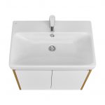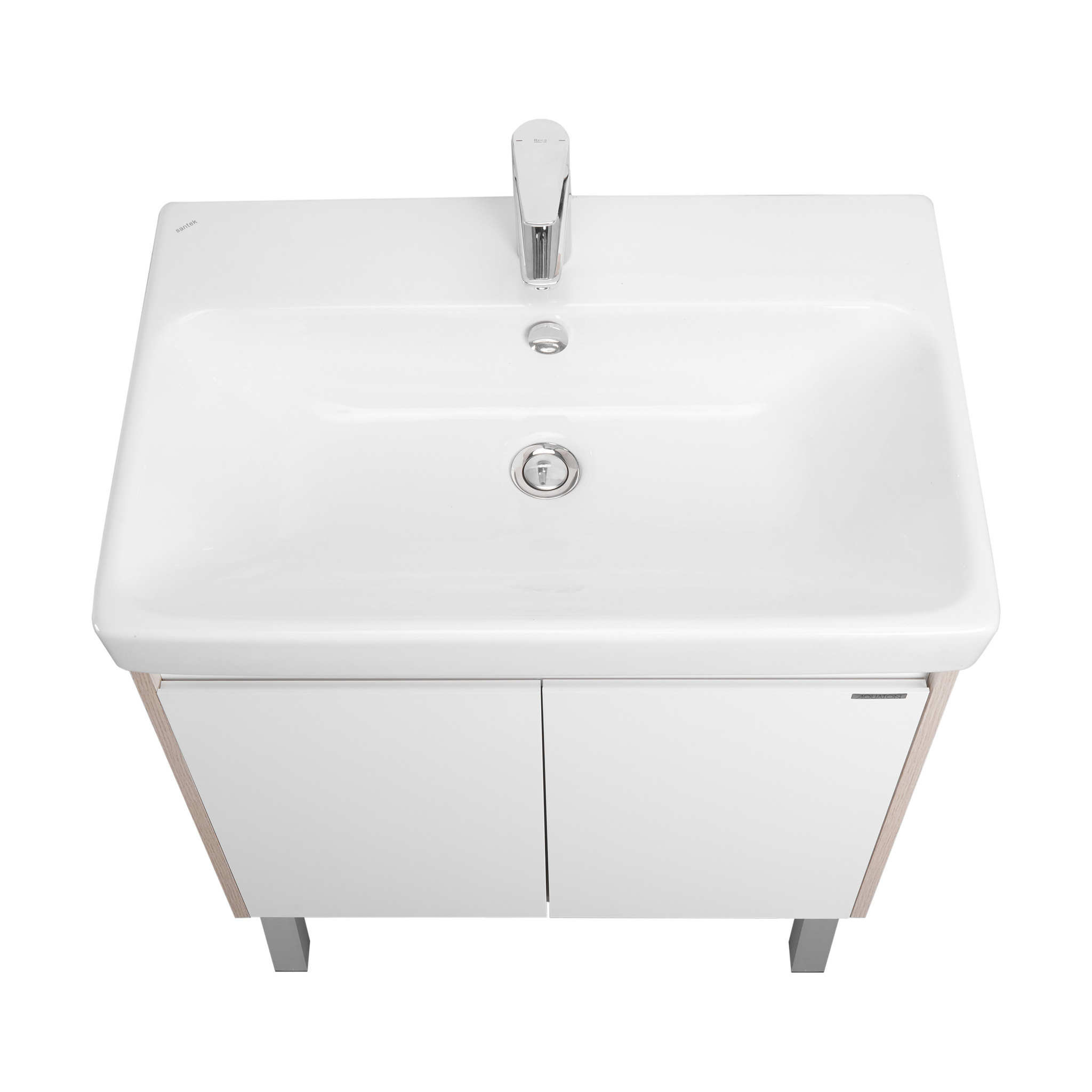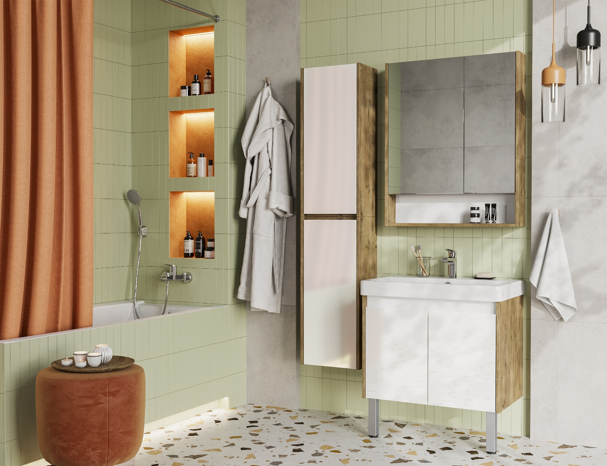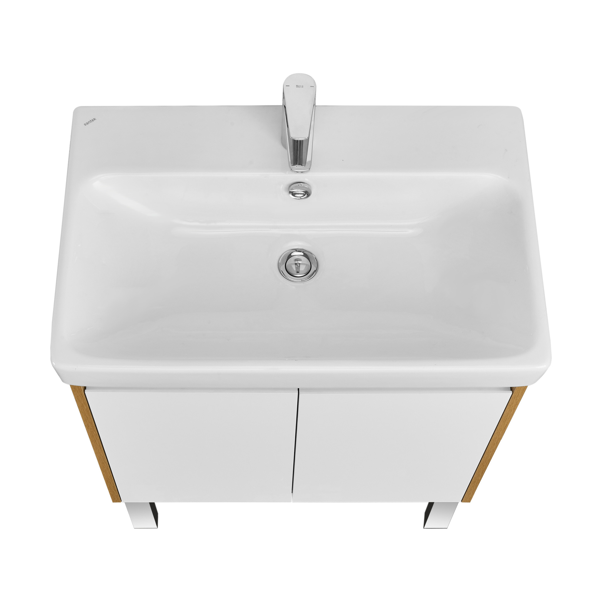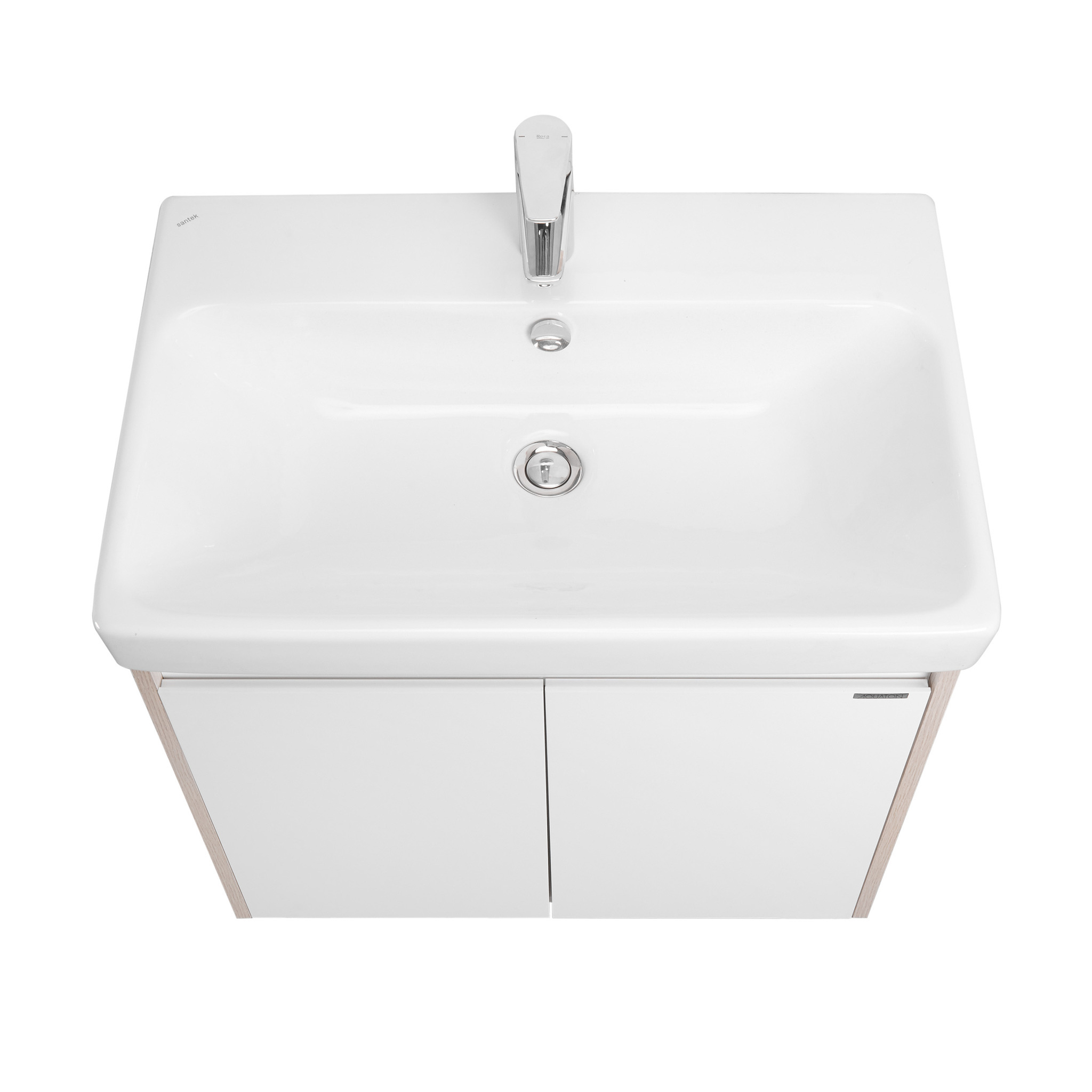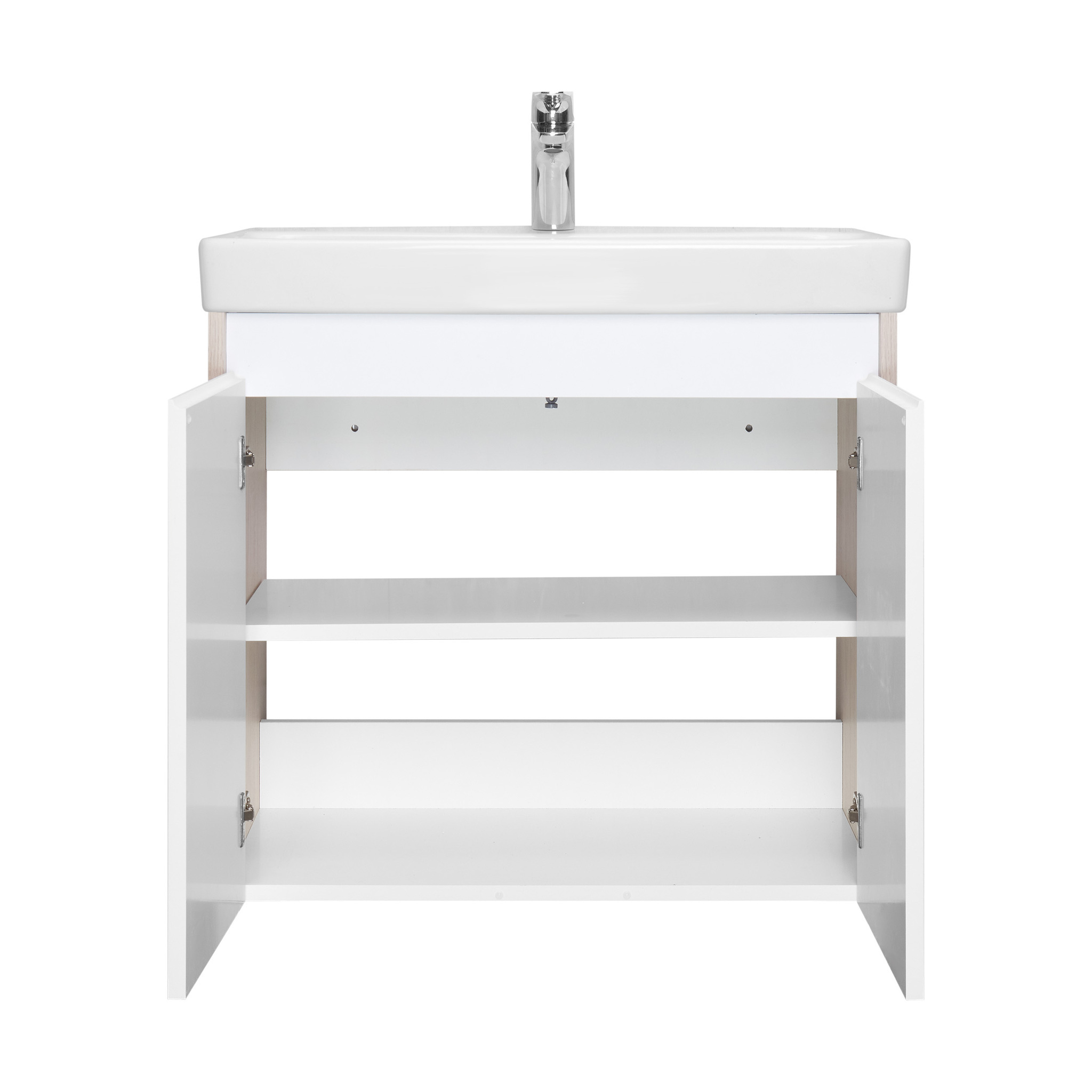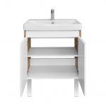 Тумба Сканди Doors 70 выполнена в популярном минималистичном скандинавском стиле. Корпус тумбы выполнен из влагостойкой ЛДСП в декоре натурального дерева, а фасады-створки в белой глянцевой покраске. За створками скрывается вместительное пространство, разделенное на две части регулируемой по высоте полкой из ВЛДСП. На тумбе нет выступающих деталей и фурнитуры, открытие створок реализуется за фасад, верхняя часть которого обработана под ручку J-профиль. К тумбе идеально подходит белоснежная раковина Адриана от бренда Santek. Раковина продается отдельно.