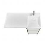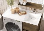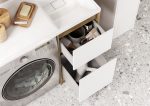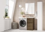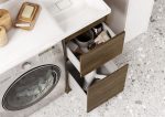 Тумба Лондри под стиральную машину выполнена из влагостойкой ламинированной плиты в древесной отделке. Корпус тумбы и фасад приобретаются отдельно. Тумбы комплектуются фасадами как с такой же древесной текстурой, так и в универсальном белом глянцевом цвете – это позволяет выбрать модель тумбы в соответствии с личными предпочтениями, создав наиболее удачное решение для конкретного интерьера ванной комнаты. Более того, при желании в одной тумбе можно совместить корпус и фасады в двух разных по оттенку древесных декорах. Верхний ящик открывается с помощью системы push-to-open, а нижний — за фасад с помощью удобного выпила под углом. Ящики выдерживают нагрузку до 25 кг. Тумба установлена на регулируемые опоры, которые находятся за цоколем. Тумба комплектуется раковиной Лондри 105 из прочного литого мрамора, который устойчив к воздействию химических средств. Широкое крыло раковины обеспечивает ванную комнату дополнительным функциональным пространством. Раковина приобретается отдельно. Дополнительно к тумбе можно приобрести шкаф-колонну Лондри и зеркальный шкаф Лондри 100.