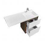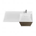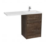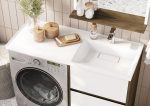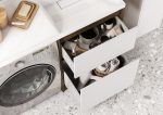 Тумба Лондри под стиральную машину выполнена из влагостойкой ламинированной плиты в древесной отделке. Корпус тумбы и фасад приобретаются отдельно. Тумбы комплектуются фасадами как с такой же древесной текстурой, так и в универсальном белом глянцевом цвете – это позволяет выбрать модель тумбы в соответствии с личными предпочтениями, создав наиболее удачное решение для конкретного интерьера ванной комнаты. Более того, при желании в одной тумбе можно совместить корпус и фасады в двух разных по оттенку древесных декорах. Верхний ящик открывается с помощью системы push-to-open, а нижний — за фасад с помощью удобного выпила под углом. Ящики выдерживают нагрузку до 25 кг. Тумба установлена на регулируемые опоры, которые находятся за цоколем. Тумба комплектуется раковиной Лондри 120 из прочного литого мрамора, который устойчив к воздействию химических средств. Широкое крыло раковины обеспечивает ванную комнату дополнительным функциональным пространством. Раковина приобретается отдельно. Дополнительно к тумбе можно приобрести шкаф-колонну Лондри и зеркальный шкаф Лондри 120.