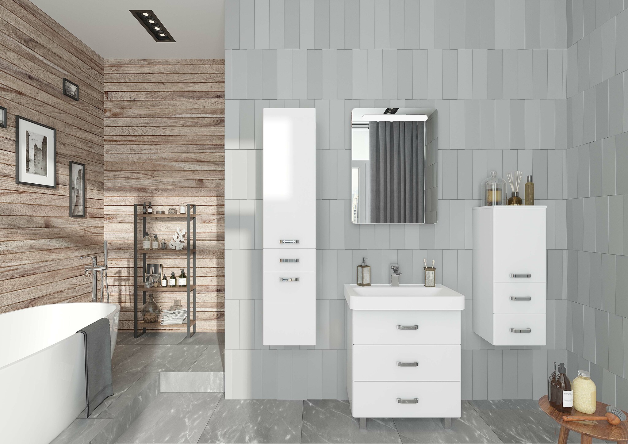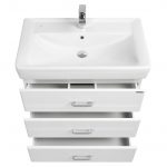 Современная лаконичная модель тумбы AQUATON Америна 80 М с тремя ящиками имеет ширину 80 см и выполнена в белоснежном глянцевом цвете. Корпус изготовлен из влагостойкой ЛДСП, а фасад — из высококачественной МДФ. Модификация на двух изящных ножках удобна для ванных комнат, где нельзя использовать подвесную мебель. Направляющие нижнего крепежа обеспечивают жёсткое и надежное крепление ящиков, а встроенные доводчики гарантируют их бесшумное и плавное закрывание. Дополнительно организовано нижнее подключение труб водоснабжения и канализации. Корпус и фасады покрыты полиэфирной краской ультрафиолетового отверждения, обеспечивающей дополнительную защиту от влаги. Для комплектации тумбы предлагается раковина Santek Тигода 80.