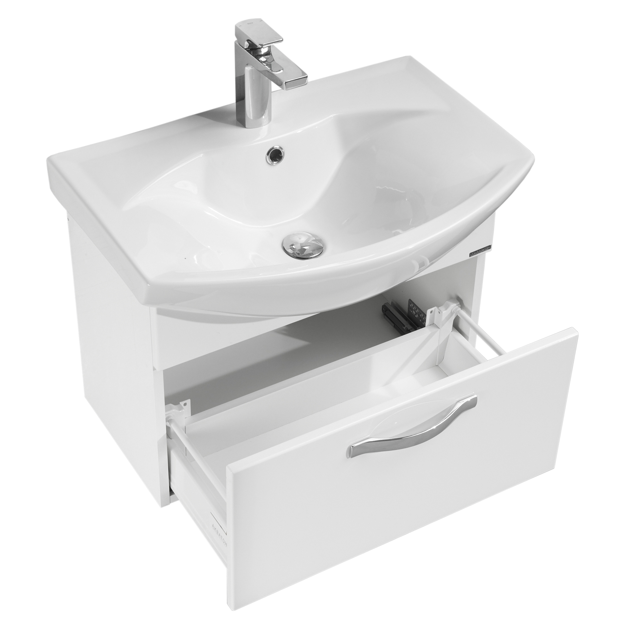 Компактная тумба Ария 65 от бренда AQUATON в белом глянцевом цвете — практичное и функциональное решение для ванных комнат в современном стиле. Влагостойкая ЛДСП и высококачественная МДФ, из которых изготовлены корпус и фасады данной модели, покрыты полиэфирной краской ультрафиолетового отверждения. Данный способ окрашивания обеспечивает изделию привлекательный внешний вид, а также износостойкость и долговечность. Подвесная модель имеет один ящик, оснащенный направляющими, которые обеспечивают его плавное выдвижение. Тумбы комплектуется белоснежной раковиной от бренда Santek. Раковина приобретается отдельно.