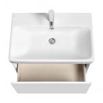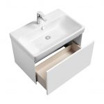 Боковые стенки тумбы под раковину АСТИ 70 выполнены из влагостойкой ЛДСП в матовой покраске, фасад тумбы из влагостойкой ДСП в белой глянцевой покраске. Трендовое сочетание двух текстур позволит интересно обыграть классический белый цвет и разнообразить мебелью АСТИ дизайн любой ванной комнаты. Ящик тумбы оснащен механизмом Push-to-Open, гарантирующим плавное открывание и закрывание. Внутренняя отделка ящика выполнена в цвете лён: приятная на ощупь и предотвращает скольжение предметов. Отличительная особенность мебели из коллекции — боковые стенки, при изготовлении которых используется особая инновационная технология. Благодаря ей создается эффект визуально тонких боковых линий, однако конструкция при этом остается надежной и прочной. Пространство для хранения в ящике тумбы можно организовать так, как удобно именно вам.