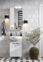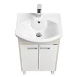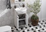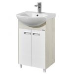 Компактная тумба в размере 50 включает в себя два фасада-створки, петли с доводчиками и регулируемую по высоте полку. Тумбы установлены на металлические ножки и укомплектованы практичными врезными ручками, которые очень удобны в использовании. Боковые стенки и фигурная планка под раковиной изготовлены из ламинированной, текстурированной влагостойкой ЛДСП в цвете дуб сомерсет, а фасады — из крашеной в белый цвет влагостойкой ЛДСП.