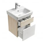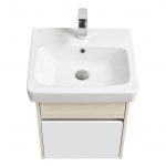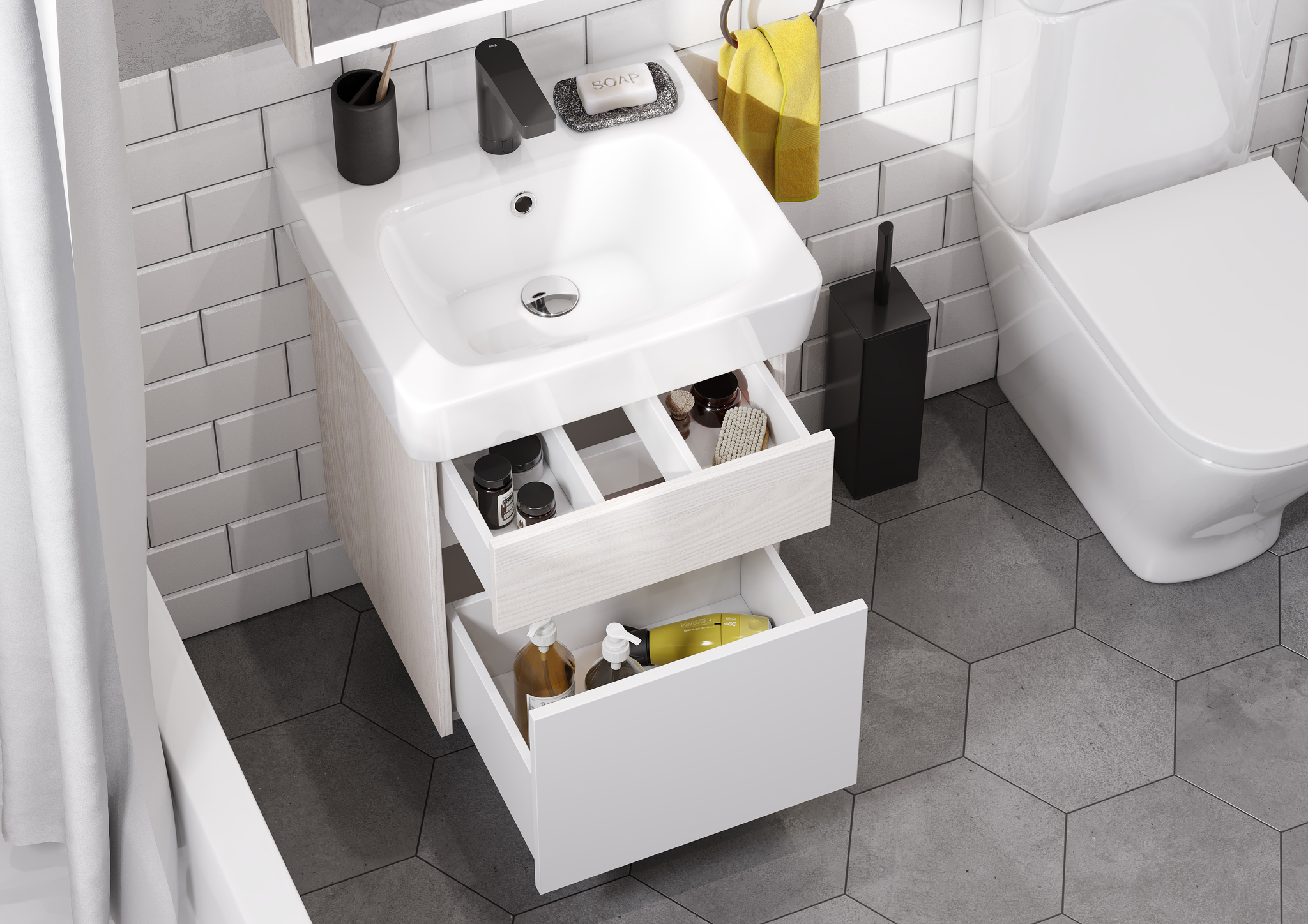 Подвесная тумба под раковину Верди PRO 50 от AQUATON — функциональное и практичное решение для ванных комнат и санузлов со скромными габаритами. Компактная модель с комбинированной отделкой не занимает много места и позволяет разместить всё необходимое. Минималистичный дизайн подчеркивает отсутствие лицевой фурнитуры. Верхний фасад и корпус тумбы изготовлены из ламинированной, текстурированной влагостойкой ЛДСП в цвете ясень фабрик. Нижний фасад выполнен из МДФ и окрашен в белый цвет высокой степени глянца. Конструкция верхнего ящика подвесных тумб разделена на две секции, что очень удобно для хранения мелких предметов. Глубокий и вместительный нижний ящик предназначен для более габаритных предметов.