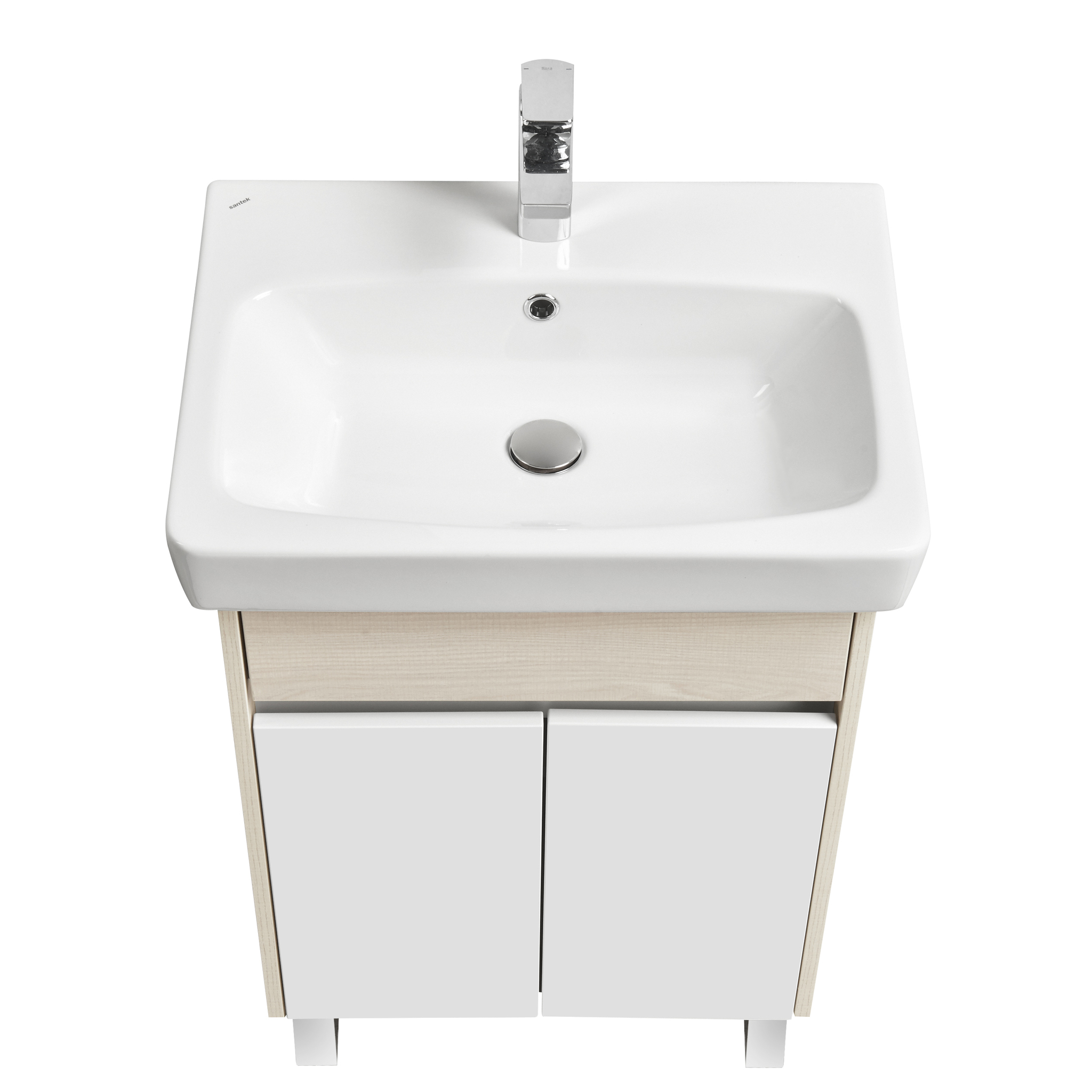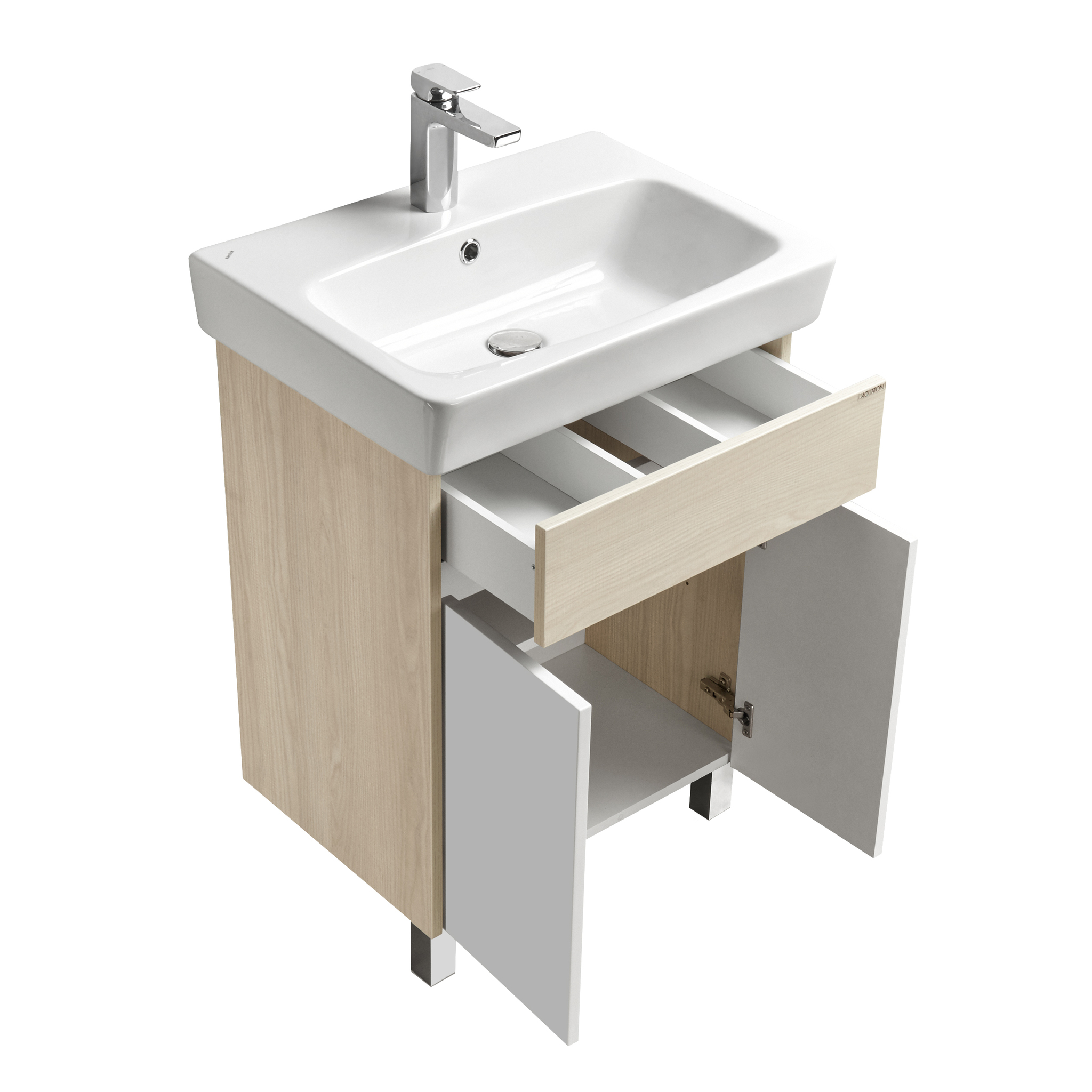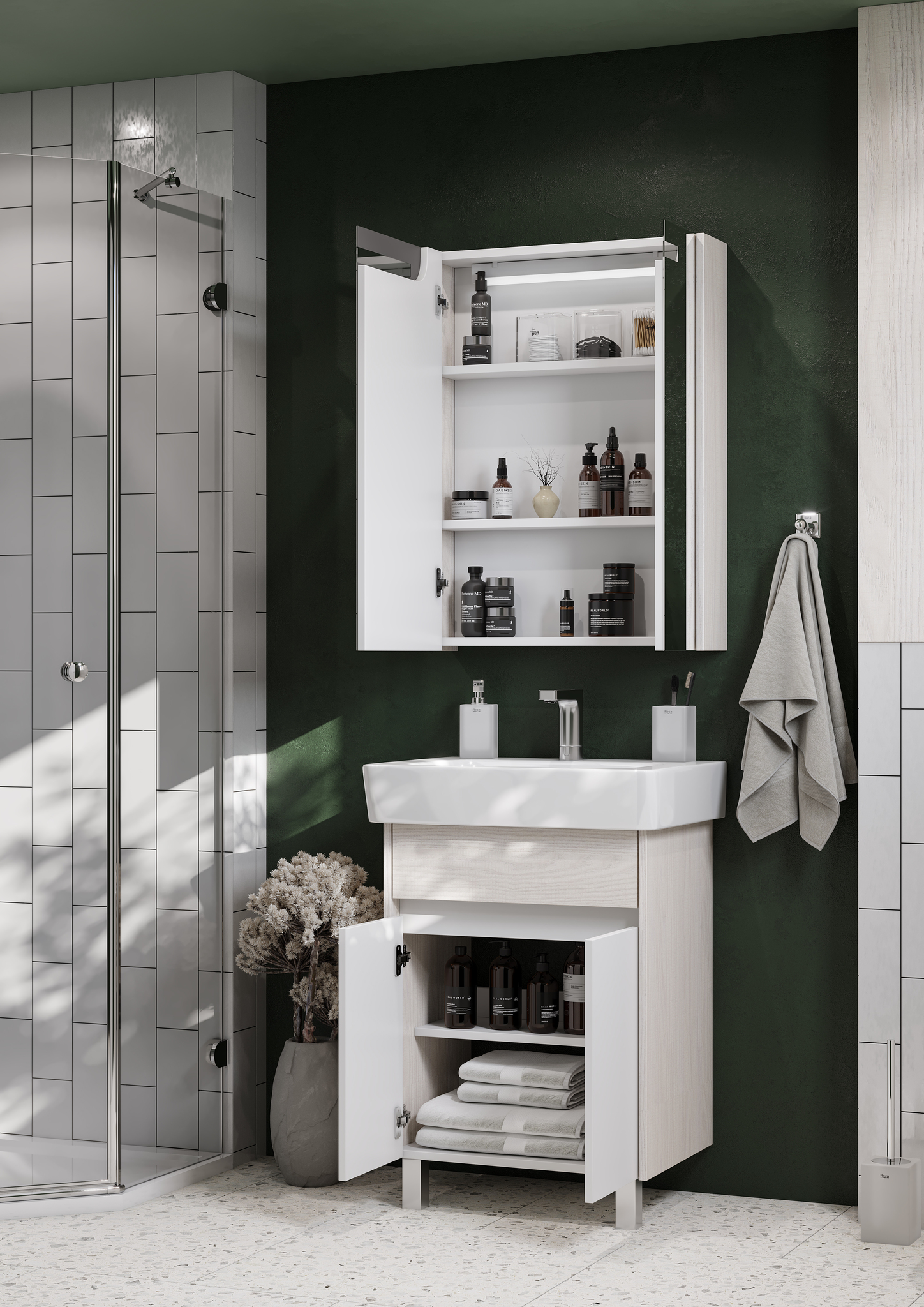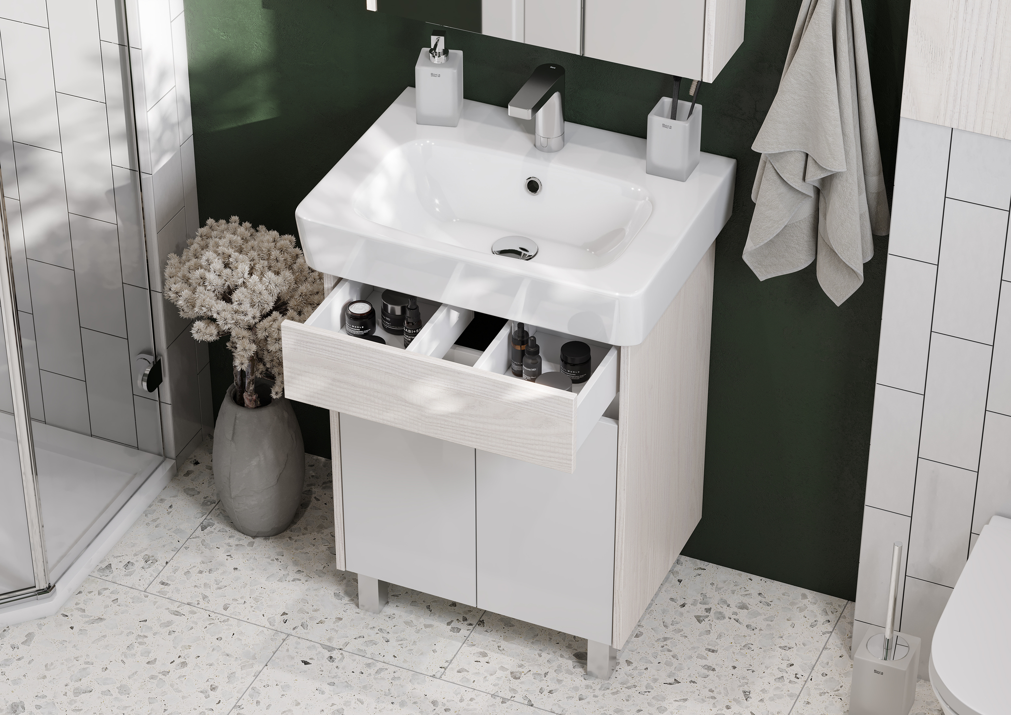 Тумба под раковину Верди PRO 60 Н от AQUATON разработана для тех, кто ценит удобство, комфорт и лаконичный изящный дизайн. Модель на двух ножках с комбинированной отделкой — стильное и современное решение в духе минимализма. Верхний фасад и корпус тумбы изготовлены из ламинированной, текстурированной влагостойкой ЛДСП в цвете ясень фабрик. Нижний фасад выполнен из МДФ и окрашен в белый цвет с высокой степенью глянца. Конструкция верхнего ящика напольной тумбы разделена на две секции, что очень удобно для хранения мелких предметов. Ящик установлен на надежные направляющие скрытого монтажа с доводчиками, которые обеспечивают его плавное и надежное закрывание. В нижней части тумбы за двумя распашными створками установлена регулируемая по высоте полка. При желании полочку можно убрать и полученное пространство — широкое и вместительное — использовать для крупных предметов. Створки закрываются плавно благодаря механическим доводчикам. В тумбе нет лицевой фурнитуры, благодаря чему комплект мебели превосходно впишется в любой интерьер. Для открывания ящика или створок достаточно потянуть за фасад.