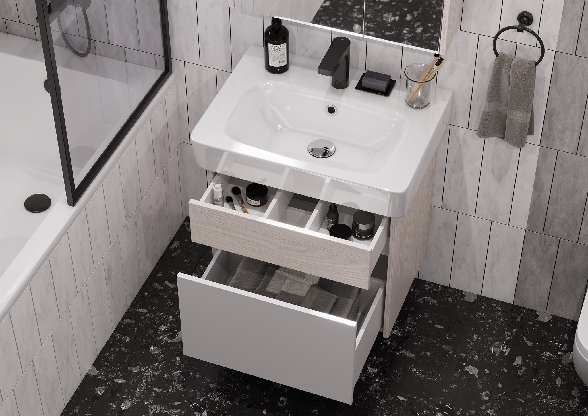 Подвесная тумба под раковину Верди PRO 60 от AQUATON разработана для тех, кто ценит удобство, комфорт и лаконичный изящный дизайн. Модель с комбинированной отделкой без лицевой фурнитуры — стильное и современное решение в духе минимализма. Верхний фасад и корпус тумбы изготовлены из ламинированной, текстурированной влагостойкой ЛДСП в цвете ясень фабрик. Нижний фасад выполнен из МДФ и окрашен в белый цвет с высокой степенью глянца. Конструкция верхнего ящика подвесных тумб разделена на две секции, что очень удобно для хранения мелких предметов. Глубокий и вместительный нижний ящик предназначен для более габаритных предметов. Плавное выдвижение обеспечивают надежные направляющие с доводчиком.