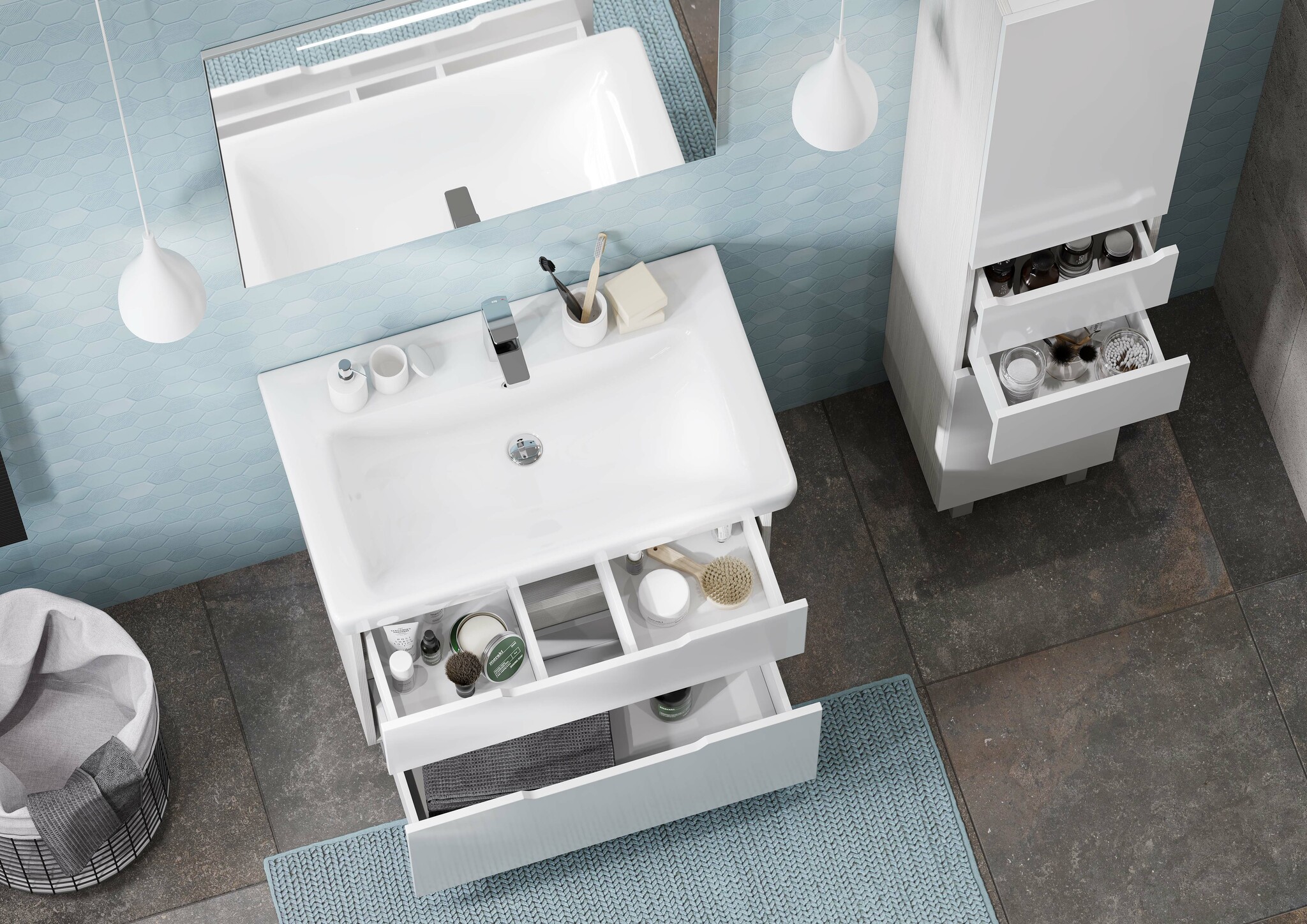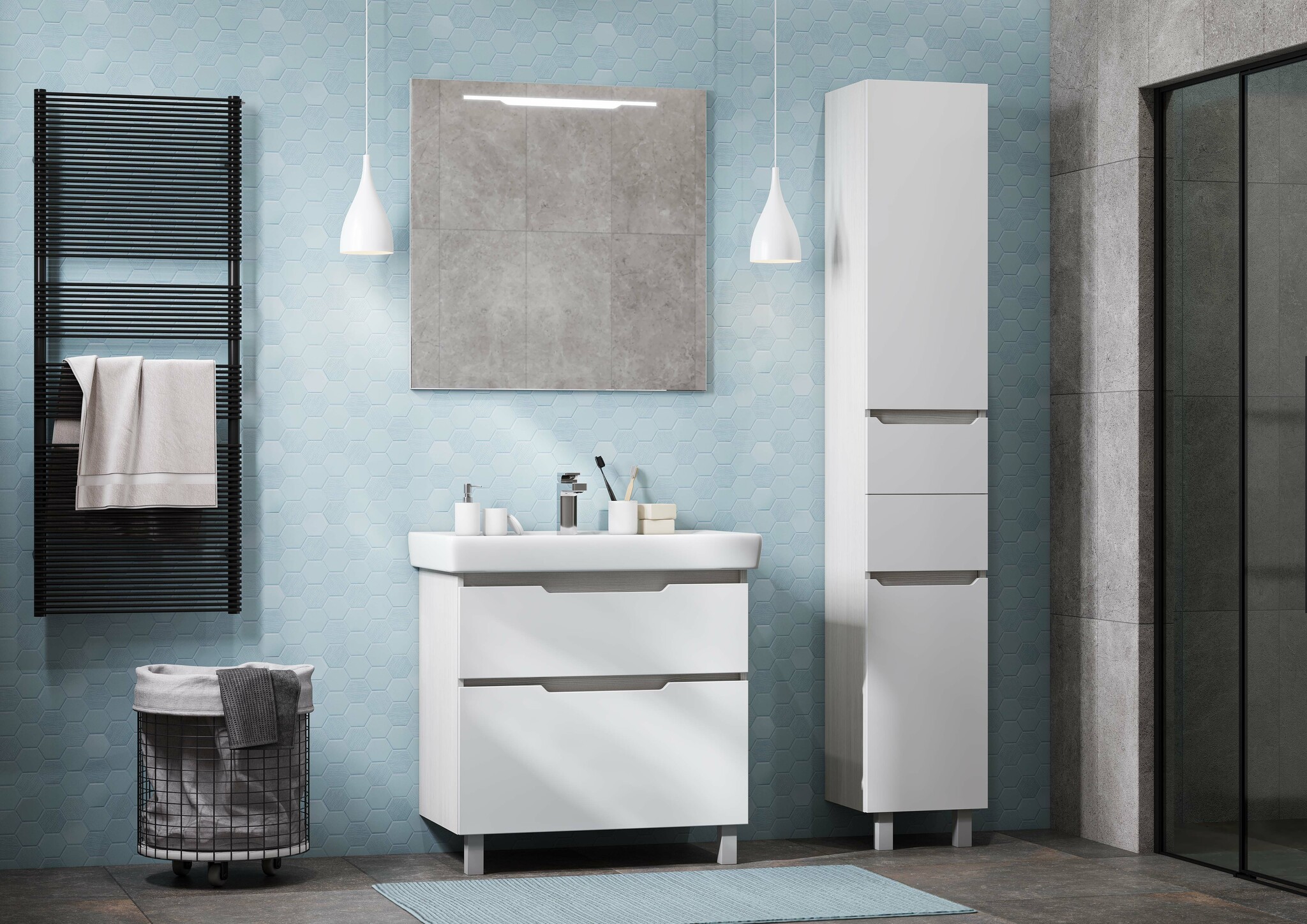Стильная и современная тумба Дакота 80 идеально впишется в ванную комнату практически любого размера. Дизайн модели не предусматривает лицевую фурнитуру — вместо нее на фасадах сделаны удобные вырезы, которые позволяют без труда открыть ящики. Боковые стенки корпуса выполнены из текстурированной ДСП в цвете выбеленное дерево, а фасады тумбы, окрашенные в белый глянец, — из МДФ. Модель имеет два выдвижных ящика, оснащенных направляющими с интегрированной системой плавного закрывания, что обеспечивает дополнительное удобство при использовании.