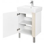 Лаконичная тумба Капри выполнена в современном дизайне: сочетание белого глянца (ВЛДСП в покраске) с древесным акцентом в цвете дуб верона (ламинированное влагостойкое ДСП). Все детали тумбы выполнены из влагостойкой ламинированной ДСП, предназначенной для использования в условиях ванной комнаты. Благодаря специальной обработке торца фасада под углом, открытие производится за створку. Универсальный функционал тумбы – распашная створка, за которой расположена полочка. Регулируемые опоры в комплекте.