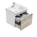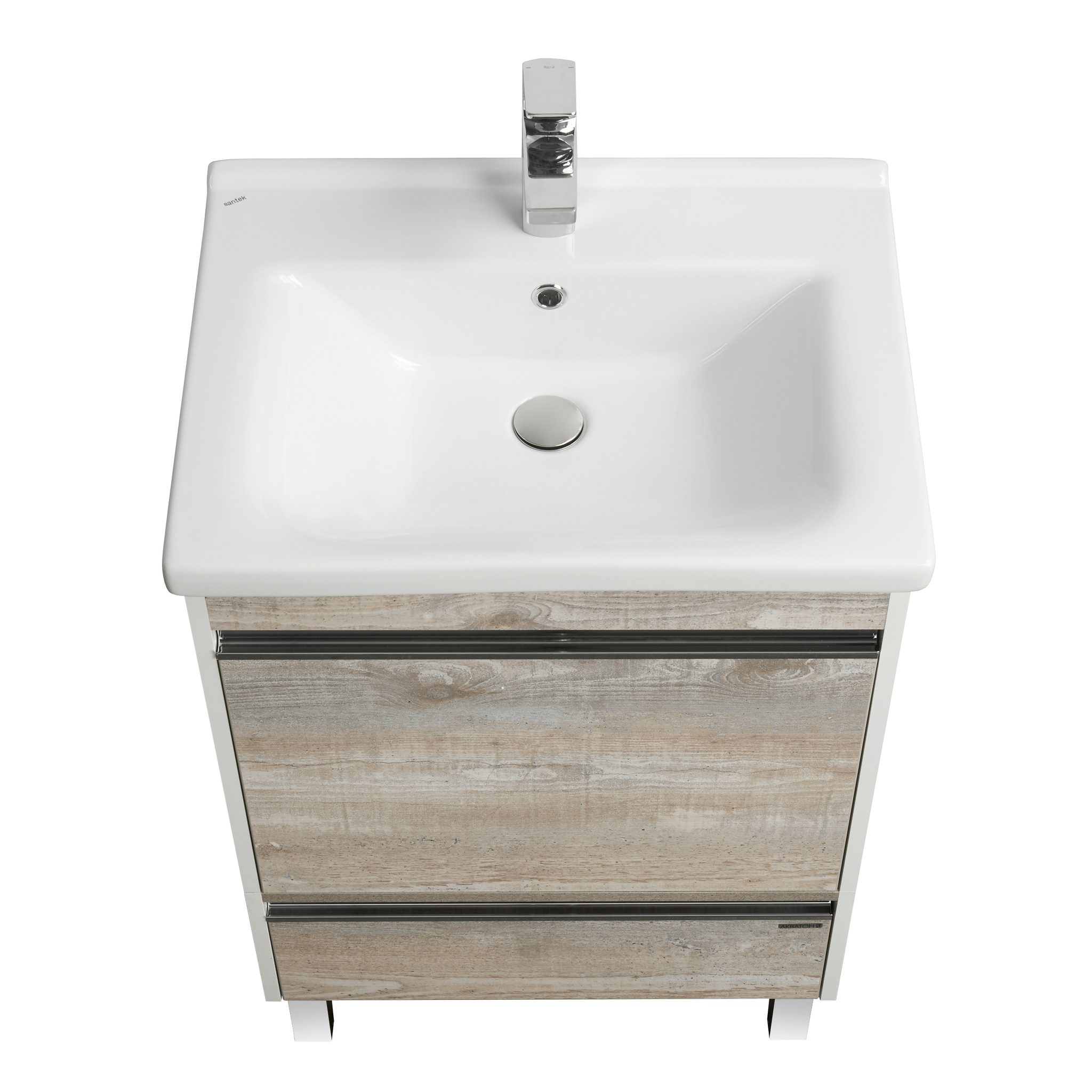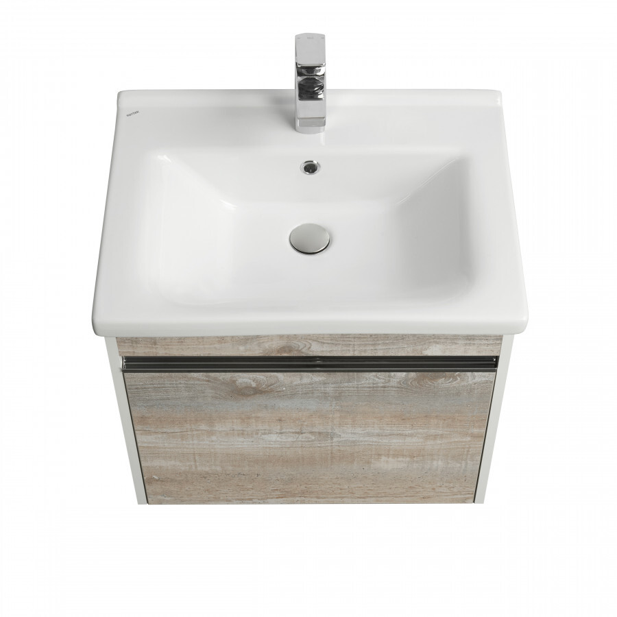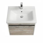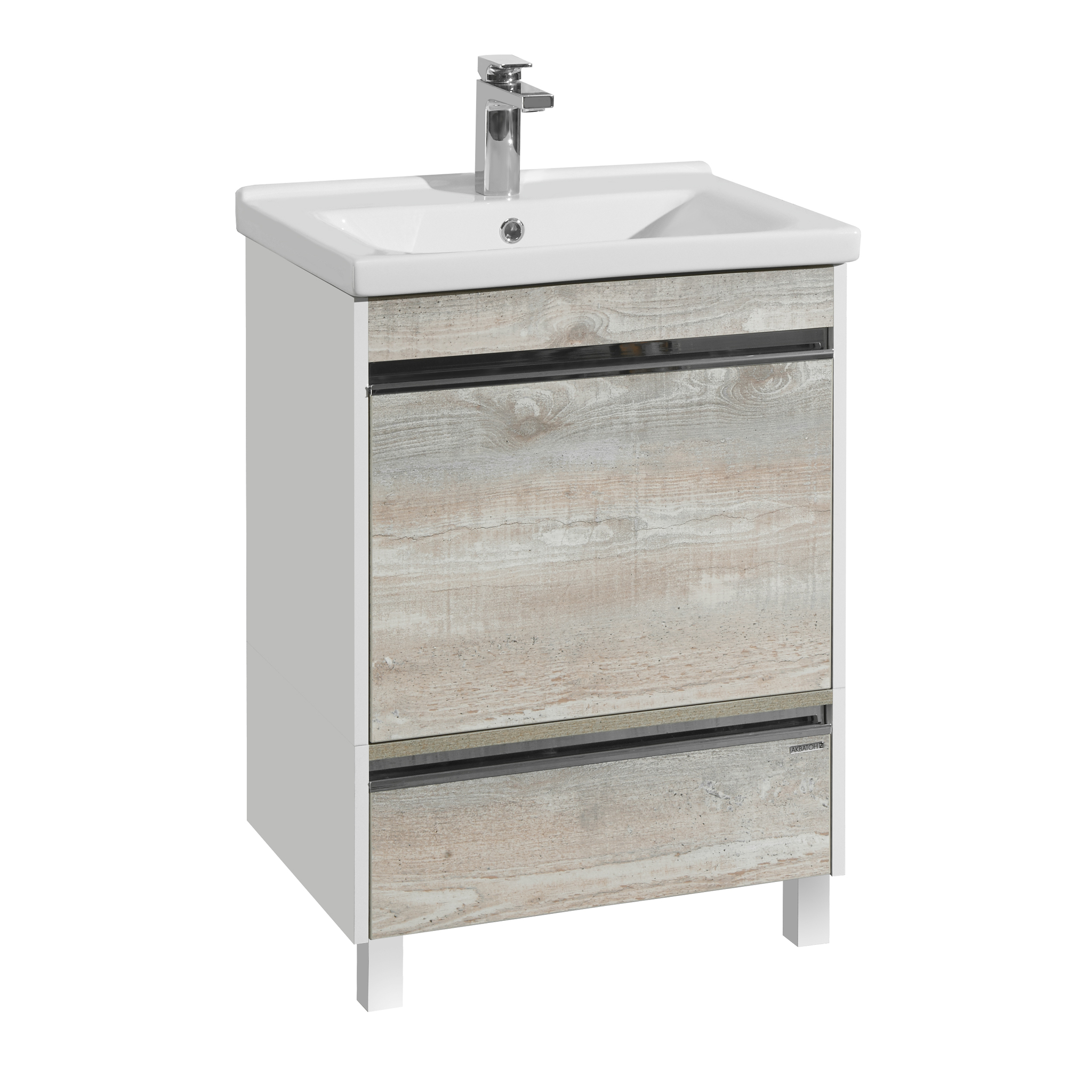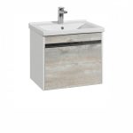 Тумба под раковину Капри 60 от AQUATON отражает современные тенденции в дизайне мебели для ванных комнат: минимализм в чистом виде с простыми и понятными формами, отсутствие лишних деталей, удобные профильные ручки, интегрированные в фасад. Корпус выполнен из влагостойкой ЛДСП и покрыт белой глянцевой краской, фасады также изготовлены из влагостойкой ЛДСП в эффектной декоративной отделке бетон пайн. Несмотря на компактные размеры, тумба предлагает удобную систему хранения, что особенно актуально для небольших ванных комнат и санузлов. Модель оборудована двумя вместительными ящиками. Комфорт и удобство при использовании гарантируют направляющие с доводчиками и интегрированная система плавного закрывания. В качестве дополнения к подвесной тумбе предлагается дополнительный комод на ножках, который может быть установлен как непосредственно под тумбой, так и со смещением влево или вправо.
