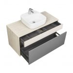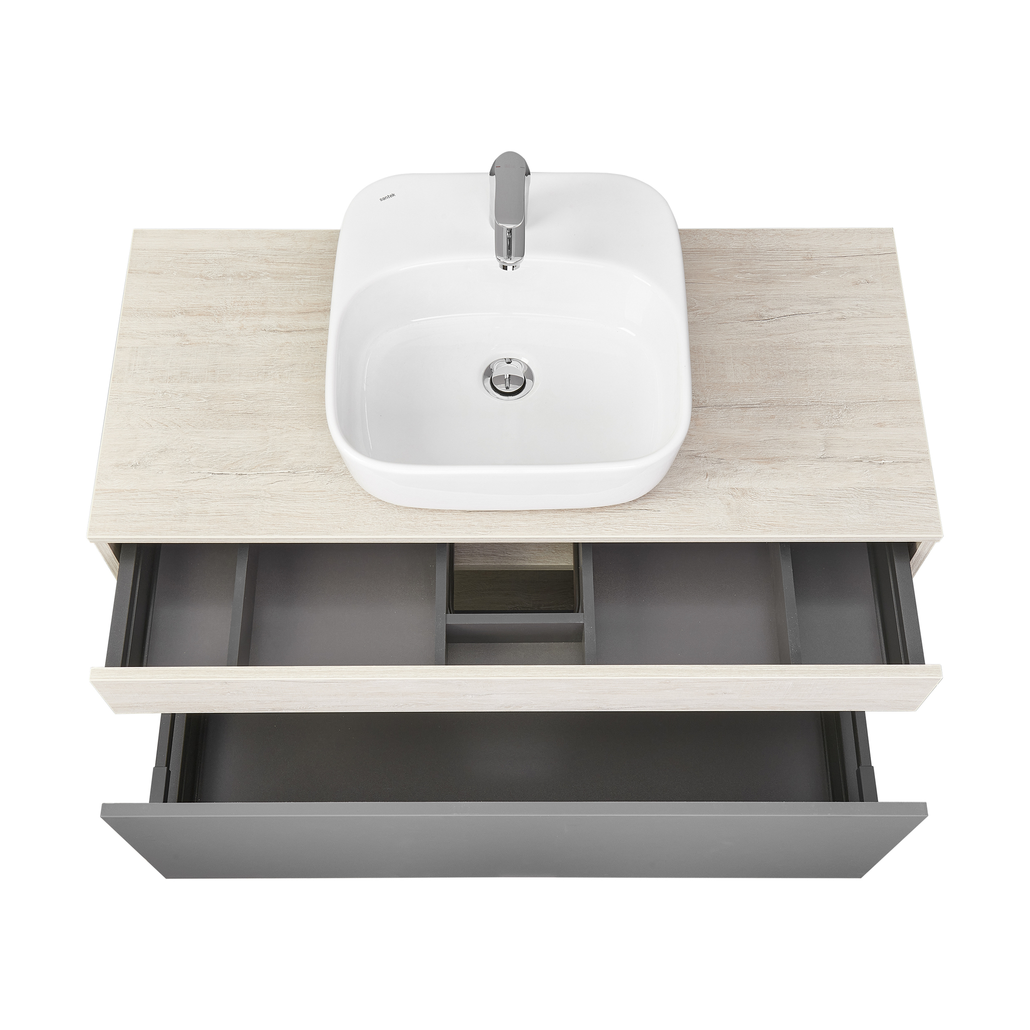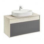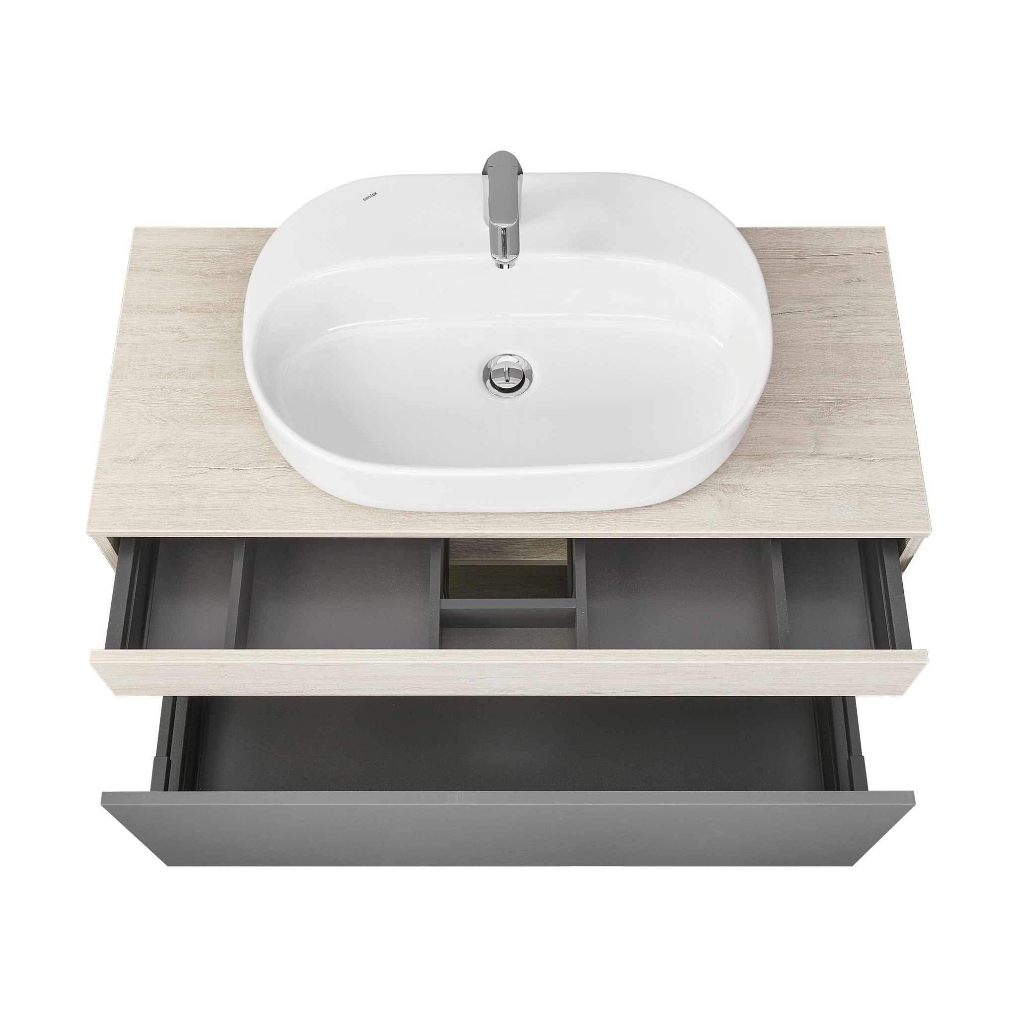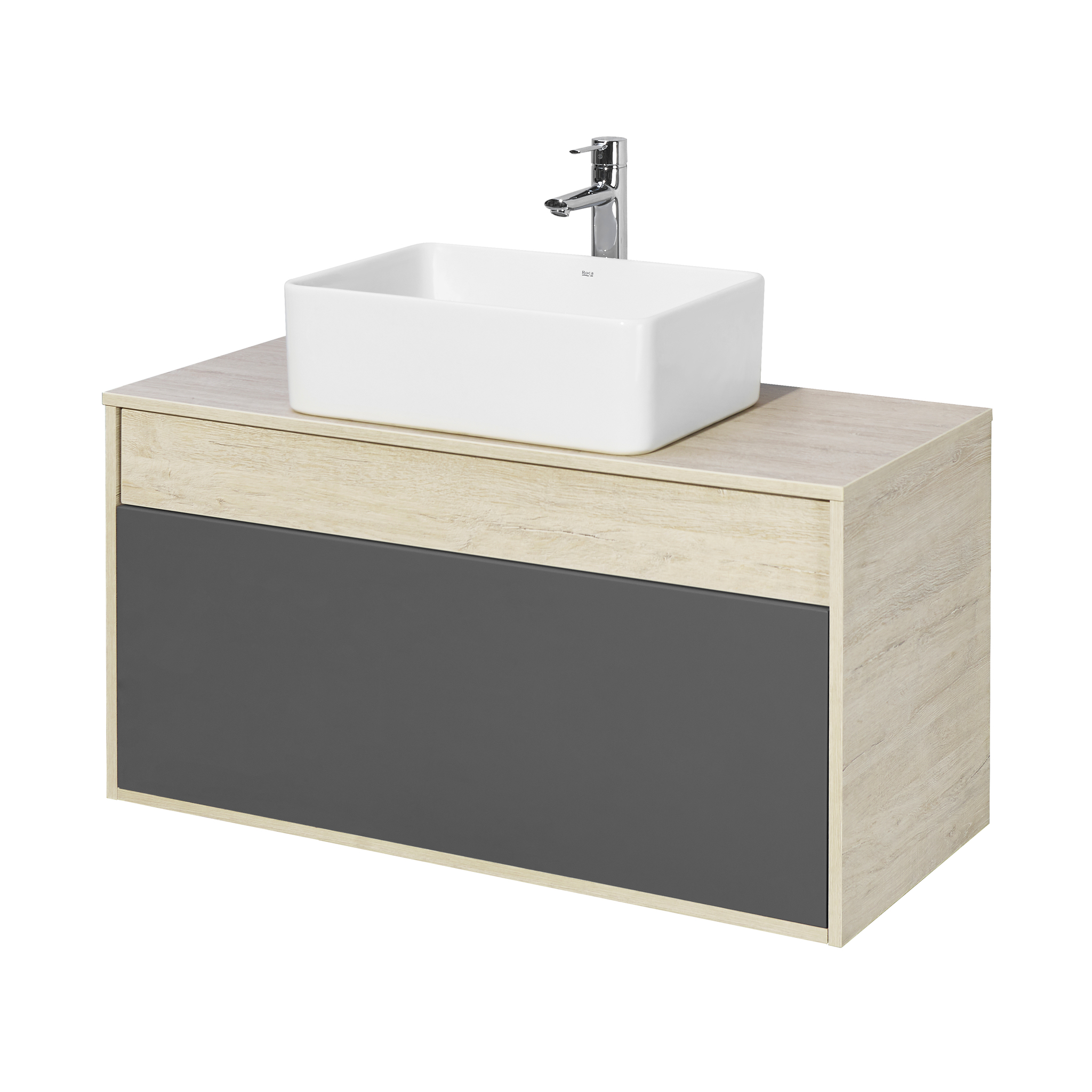 Модуль 100 коллекции Лофт Урбан функционально состоит из двух ящиков полного выдвижения. Верхний ящик тумбы комплектуется внутренней организацией пространства: в нем очень удобно хранить небольшие аксессуары и принадлежности. Вместительный нижний высокий ящик подойдет для более крупных предметов. Функция полного выдвижения ящиков и система открывания push-to-open делают использование тумбы особенно комфортным. Подвесной модуль может комплектоваться различными по размеру и дизайну металлическими черными опорами, высокими и низкими, которые крепятся непосредственно под модуль, кроме того, доступен вариант установки модуля и без опор. Корпус тумбы выполнен из влагостойкой ламинированной ДСП в цвете дуб орегон с текстурой натурального дерева, выгодно подчеркнутым фасадами из МДФ в пленке антрацит с эффектом soft touch.