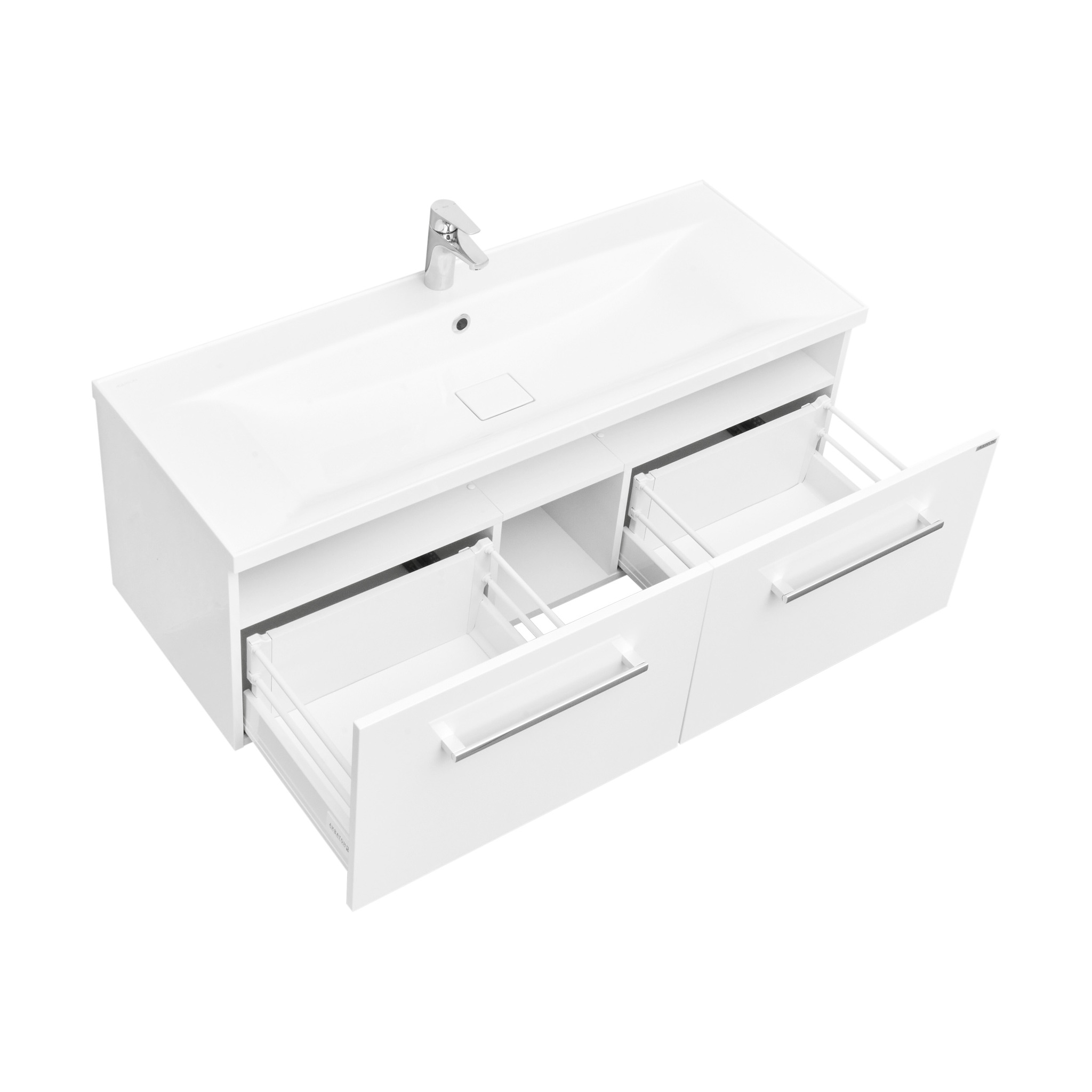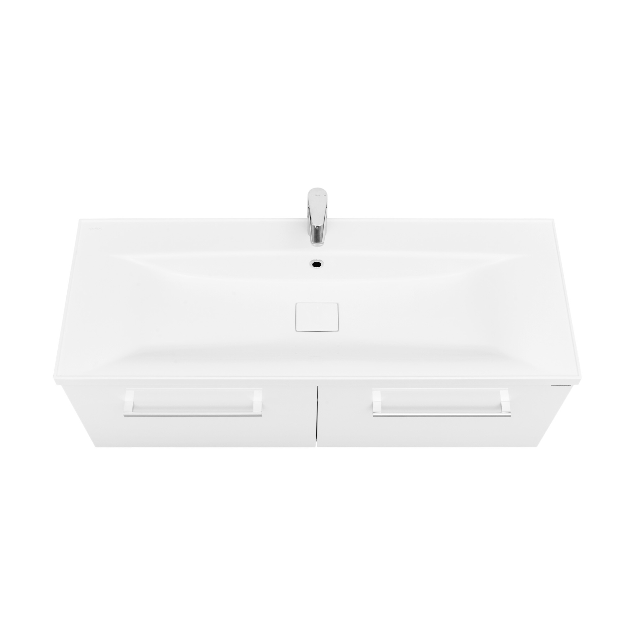 Тумба Мадрид 120 М от AQUATON в белом цвете — воплощение эстетики минимализма в чистом виде. Модель привлекает внимание простотой форм и четкостью линий. Корпус из влагостойкой ЛДСП и фасад из высококачественной МДФ покрыты полиэфирной краской ультрафиолетового отверждения с высокой степенью глянца. Тумба оснащена двумя вместительными ящиками с доводчиками и встроенной системой плавного закрывания. Фасад верхнего ящика визуально разделен на два отсека. Для комплектации тумбы отлично подходит прямоугольная раковина AQUATON Айрис.