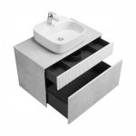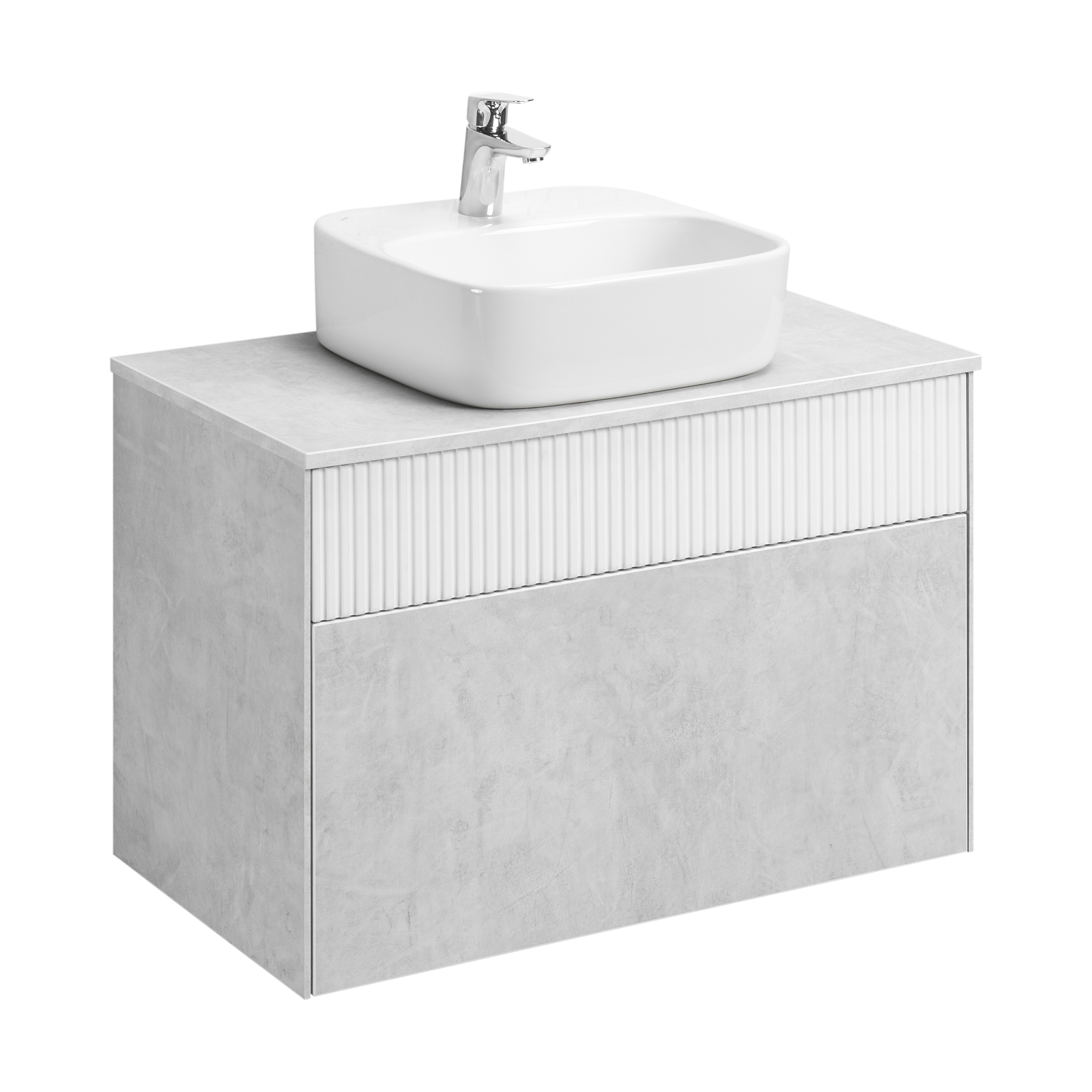 Тумба Марбл 80 функционально состоит из двух вместительных ящиков, оснащенных системой push to open, обеспечивающей надежное, комфортное и бесшумное закрывание. Дополнительно предусмотрены 2 регулируемые планки для внутренней организации пространства. Верхний фасад изделия выполнен из МДФ с реечной фрезеровкой в белой матовой пленке с эффектом soft touch, а нижний фасад и корпус из ламинированной влагостойкой ДСП Слэйт. Верхний и нижний ящики позволяют содержать косметические средства в идеальном порядке. Тумба комплектуется различными по форме накладными раковинами: Santek Одри Soft, Santek Одри Round, Aquaton Лола, Roca Mila круглая и Roca Mila прямоугольная. Раковины продаются отдельно.