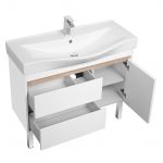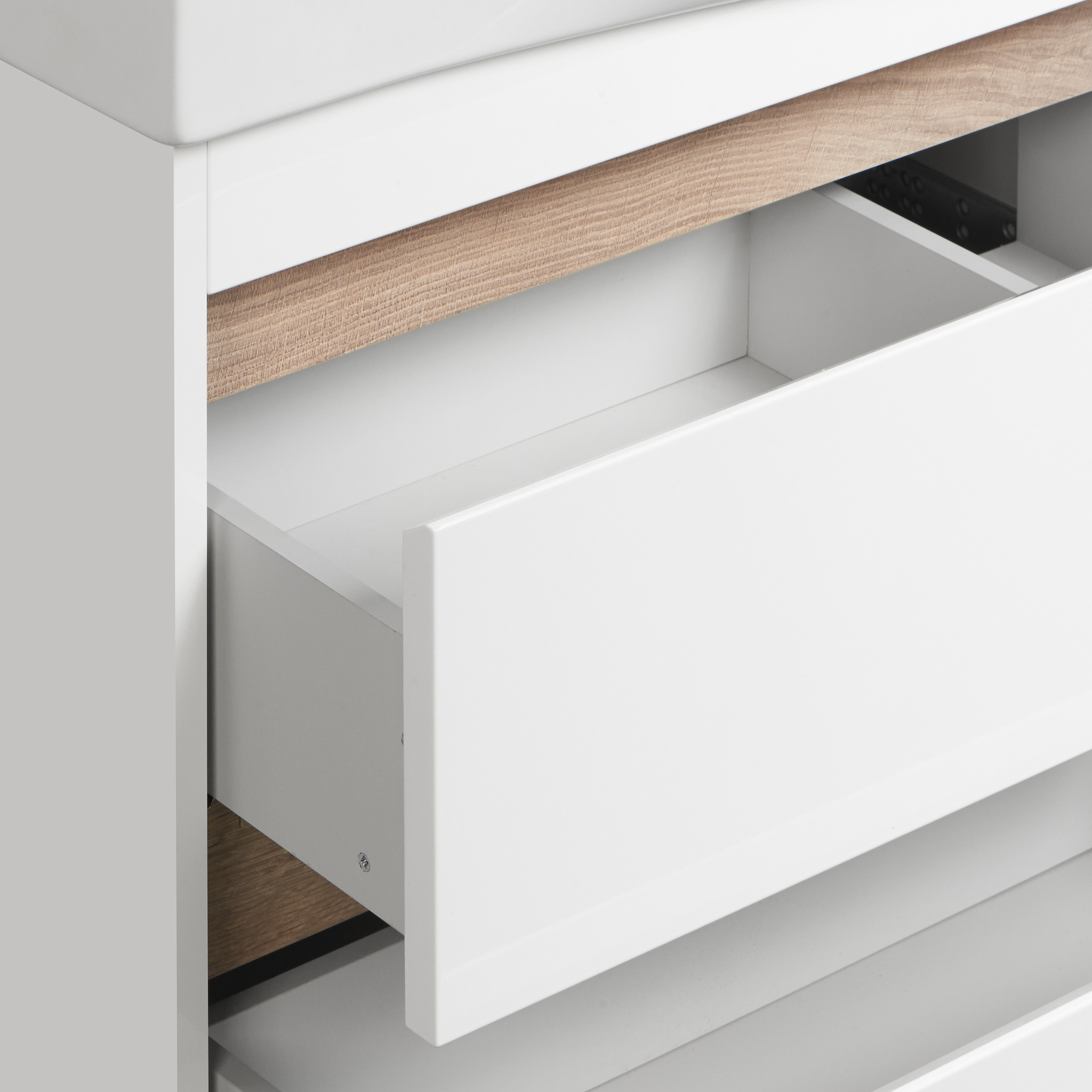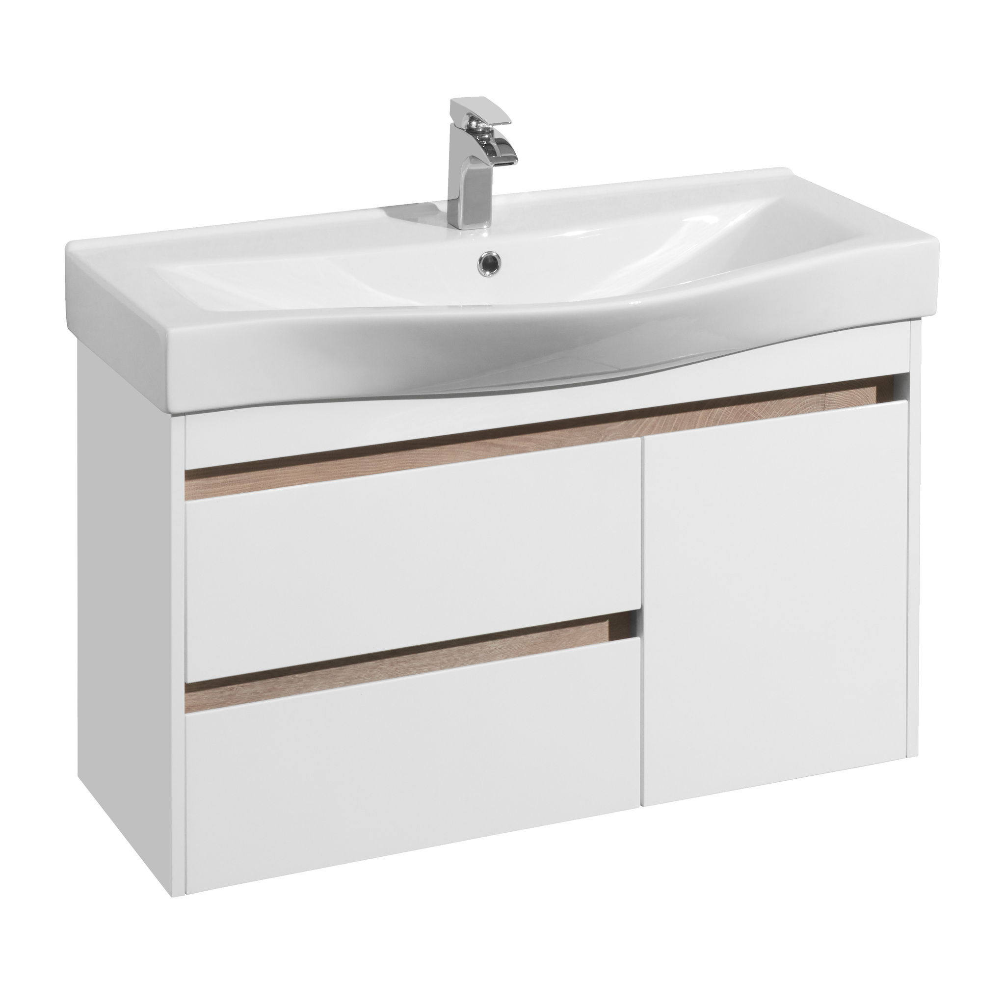 Тумба Нортон 100 в лаконичном дизайне универсальна для любого интерьера ванной комнаты. Корпус тумбы выполнен из влагостойкой ЛДСП, а фасады из МДФ в белой глянцевой покраске. Дизайн тумбы подчеркивает декоративная вставка из ЛДСП с фактурой натурального дерева дуб эндгрейн. Конструктивно тумба состоит из 2 вместительных ящиков, установленных на направляющие с доводчиками для комфортного использования и фасада-створки, за которым находится ниша с регулируемой полочкой. На тумбе нет выступающих деталей и фурнитуры, открытие ящиков реализовано за счет удобного выреза на фасаде. Тумба комплектуется белоснежной раковиной Беверли от бренда Santek. Раковина приобретается отдельно. Тумбу можно использовать в двух вариантах: подвесную или дополнительно приобрести опоры 1A222703SI000.