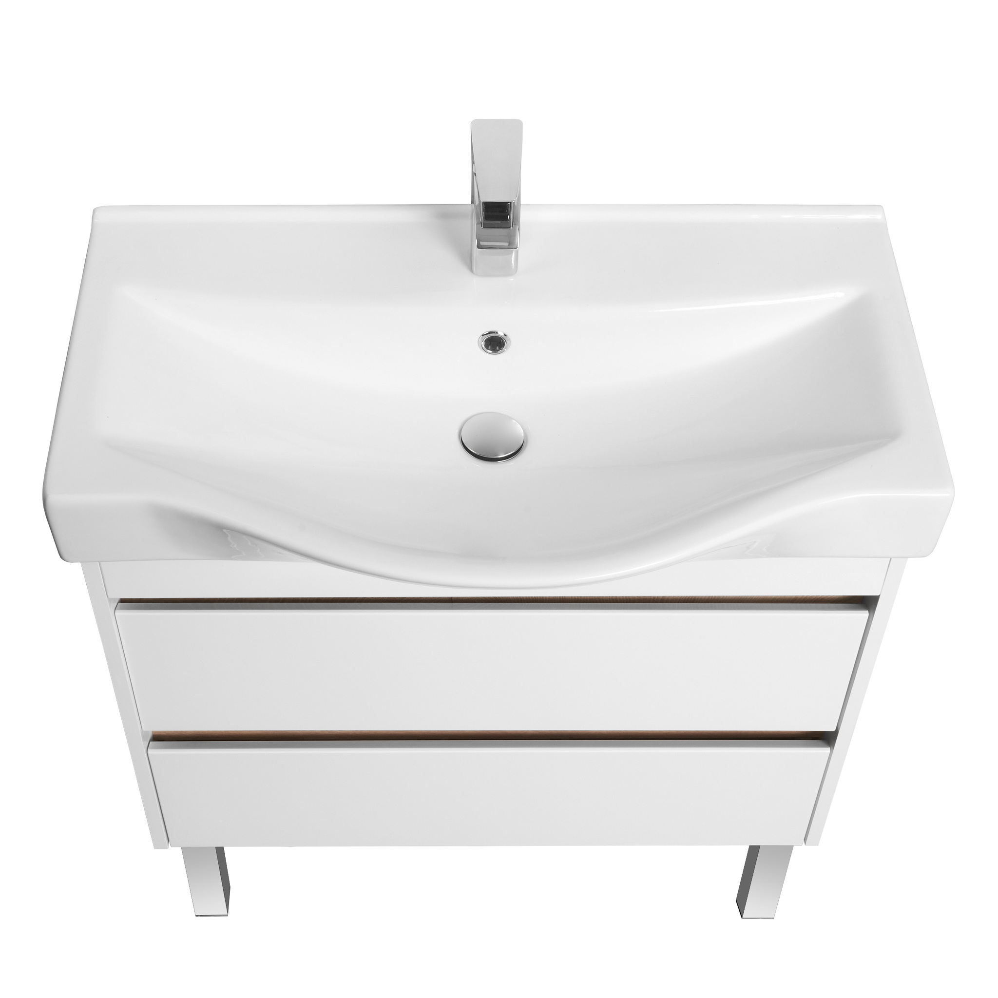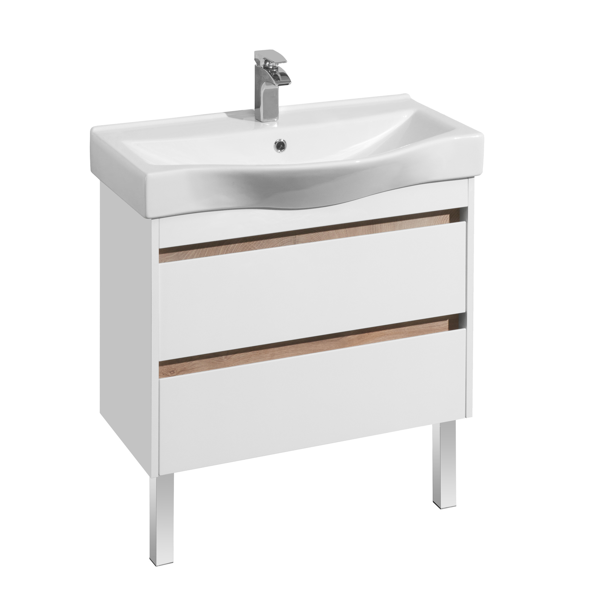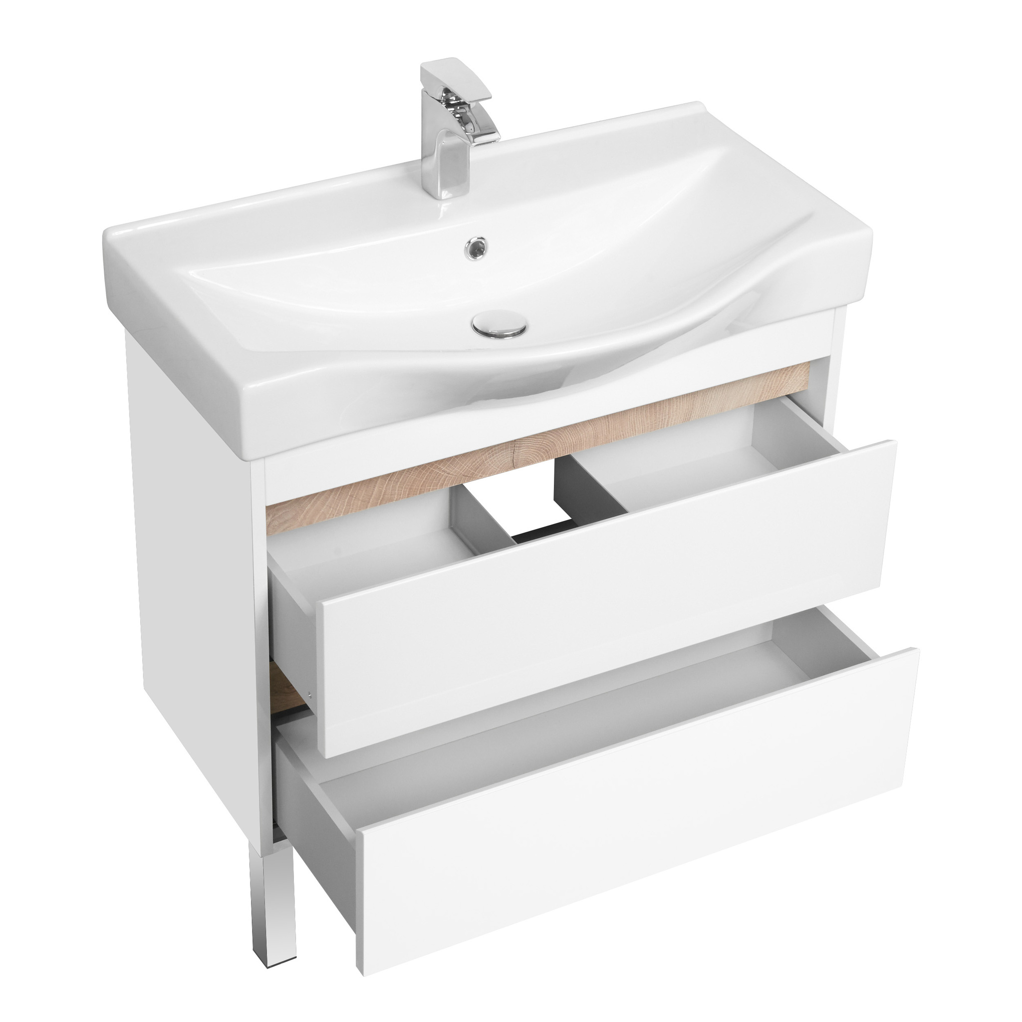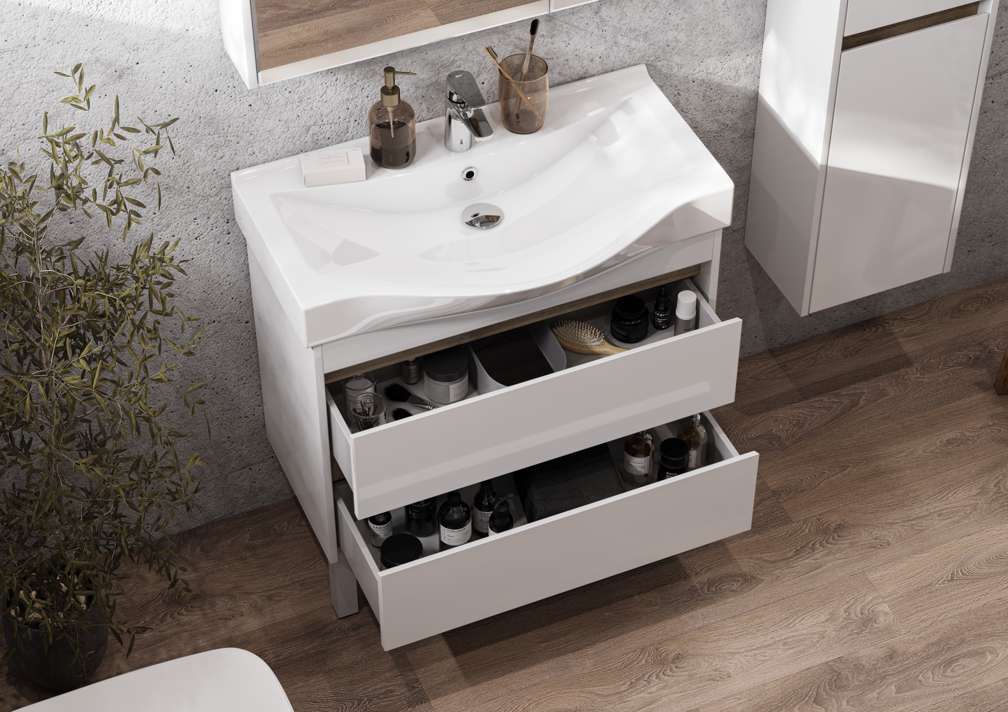 Тумба Нортон 80 в лаконичном дизайне универсальна для любого интерьера ванной комнаты. Корпус тумбы выполнен из влагостойкой ЛДСП, а фасады из МДФ в белой глянцевой покраске. Дизайн тумбы подчеркивает декоративная вставка из ЛДСП с фактурой натурального дерева дуб эндгрейн. Конструктивно тумба состоит из 2 вместительных ящиков, установленных на направляющие с доводчиками для комфортного использования. На тумбе нет выступающих деталей и фурнитуры, открытие ящиков реализовано за счет удобного выреза на фасаде. Тумба комплектуется белоснежной раковиной Беверли от бренда Santek. Раковина приобретается отдельно. Тумбу можно использовать в двух вариантах: подвесную или дополнительно приобрести опоры 1A222703SI000.
