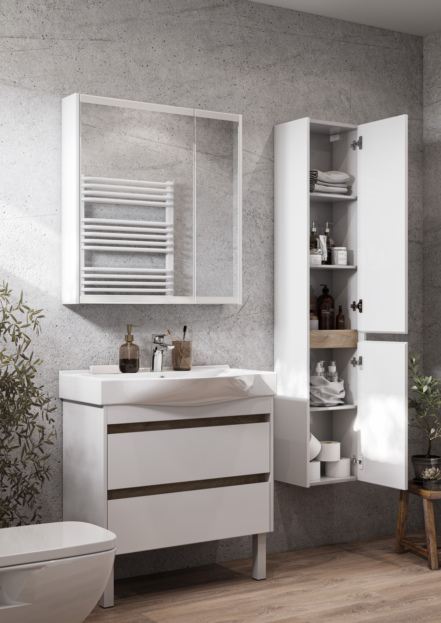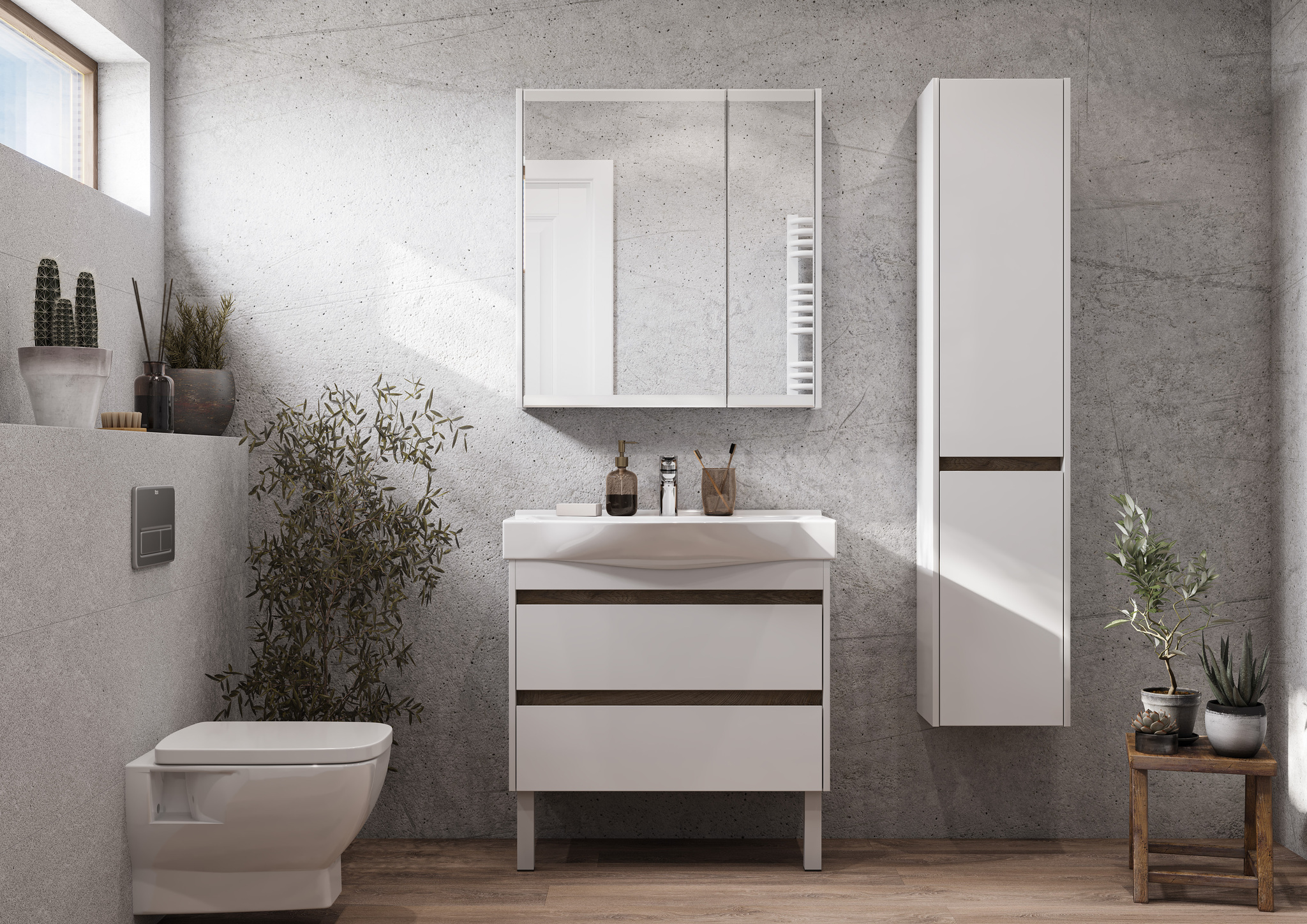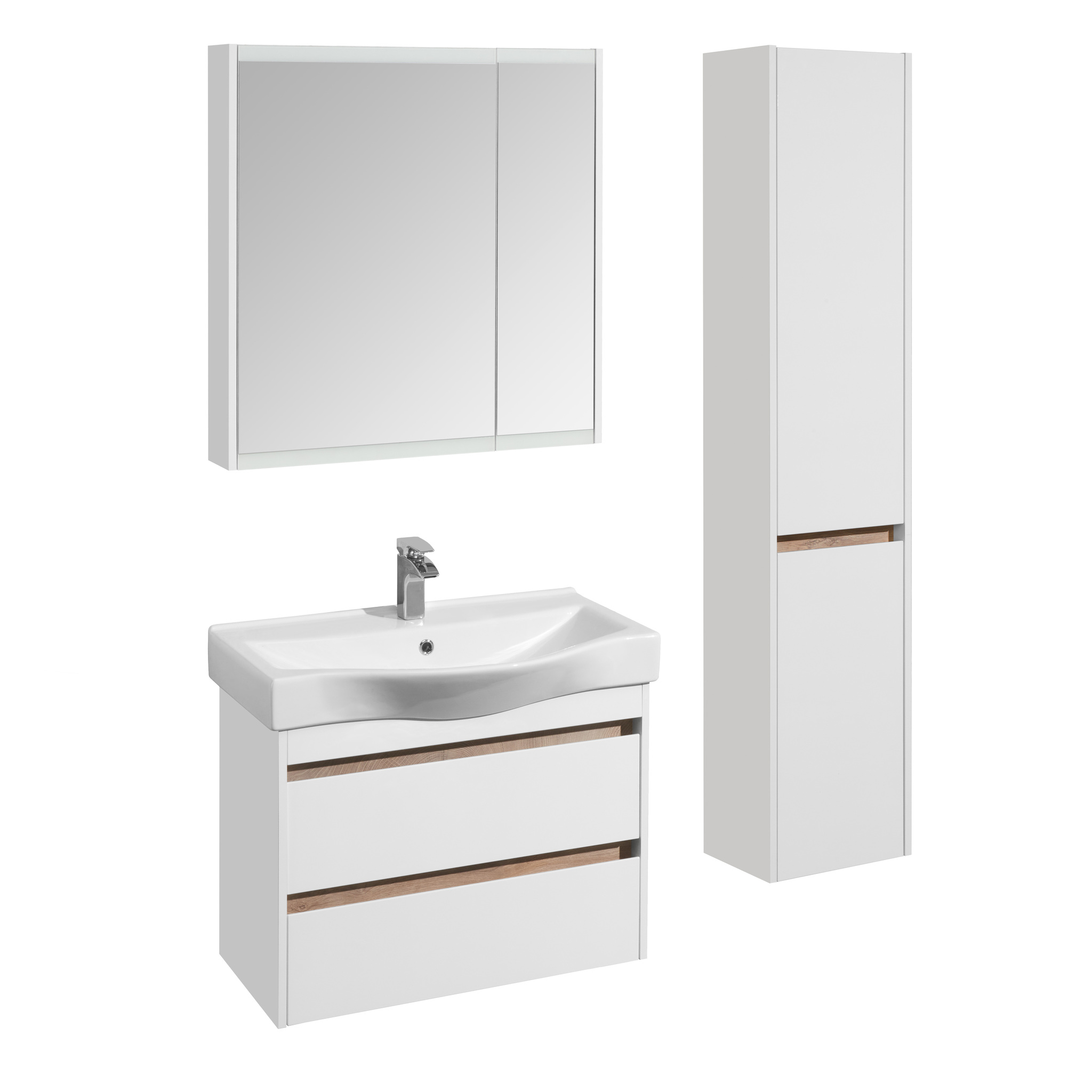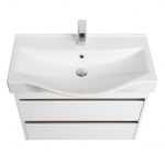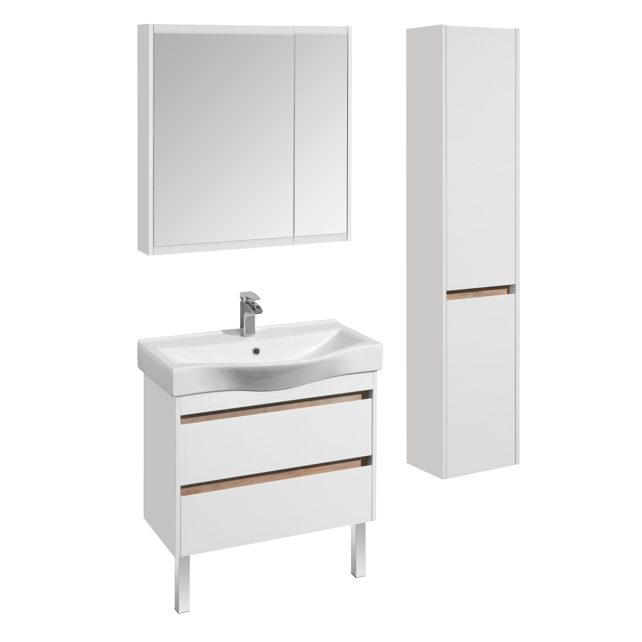 Тумба Нортон 80 в лаконичном дизайне универсальна для любого интерьера ванной комнаты. Корпус тумбы выполнен из влагостойкой ЛДСП, а фасады из МДФ в белой глянцевой покраске. Дизайн тумбы подчеркивает декоративная вставка из ЛДСП с фактурой натурального дерева дуб эндгрейн. Конструктивно тумба состоит из 2 вместительных ящиков, установленных на направляющие с доводчиками для комфортного использования. На тумбе нет выступающих деталей и фурнитуры, открытие ящиков реализовано за счет удобного выреза на фасаде. Тумба комплектуется белоснежной раковиной Беверли от бренда Santek. Раковина приобретается отдельно. Тумбу можно использовать в двух вариантах: подвесную или дополнительно приобрести опоры 1A222703SI000.