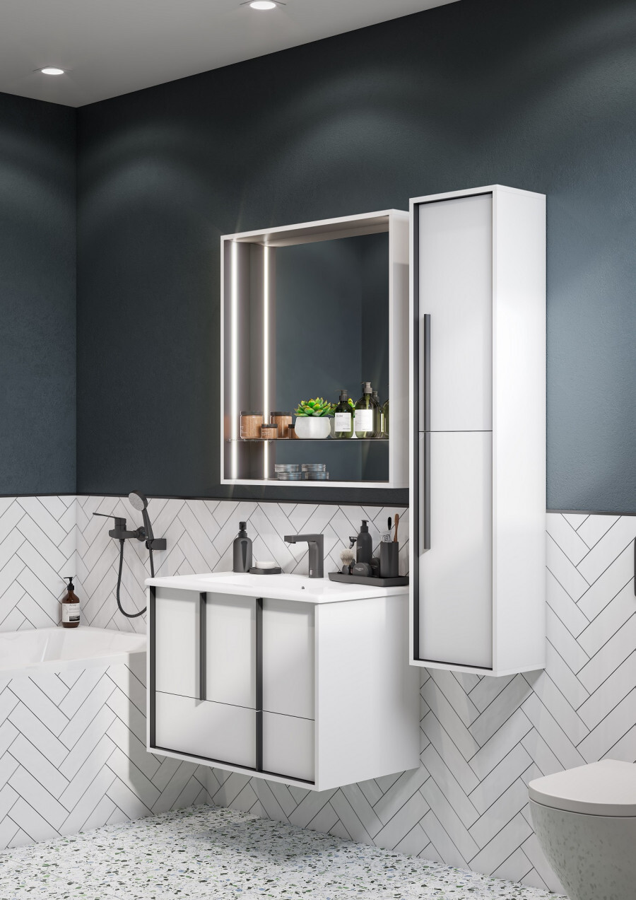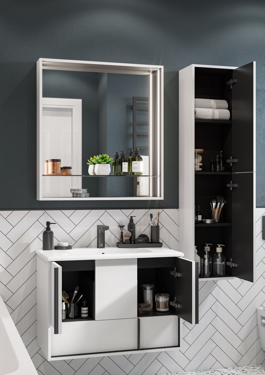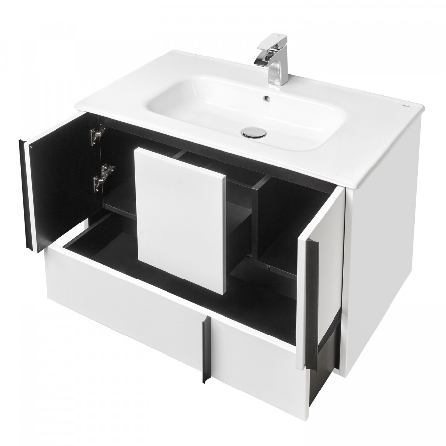 Эффектное классическое сочетание чёрного и белого — лаконичная и всегда беспроигрышная комбинация. Тумба Ривьера 80 выполнена из МДФ чёрного цвета и покрыта белой матовой пленкой, что позволяет создать яркий контраст. Пленка позволяет надежно защитить мебель от воздействия влажной среды ванной комнаты. Центральный ящик тумбы оснащен системой push-to-open, слева и справа за распашными фасадами удобные ниши и вместительный нижний ящик позволит удобно расположить косметические и моющие средства. Необычные чёрные матовые ручки комфортны в использовании и подчеркивают чёткую геометрию линий. Комфорт при использовании обеспечивают надежные петли с доводчиками и направляющие с системой плавного закрывания. Дополнит комплект керамическая раковина Victoria Unik от бренда Roca.