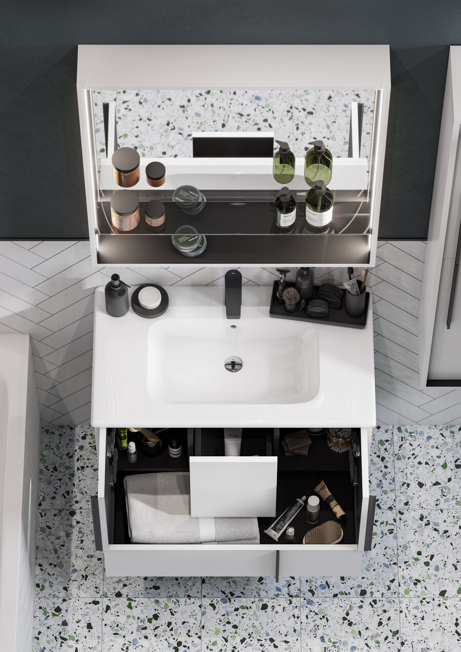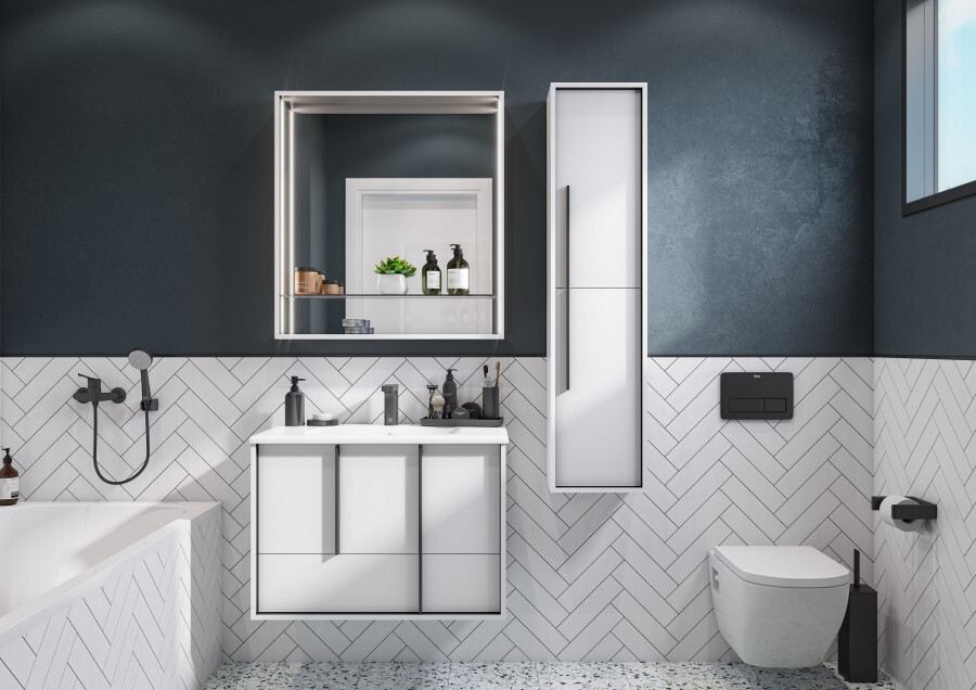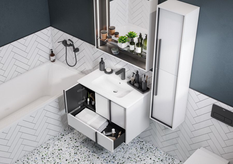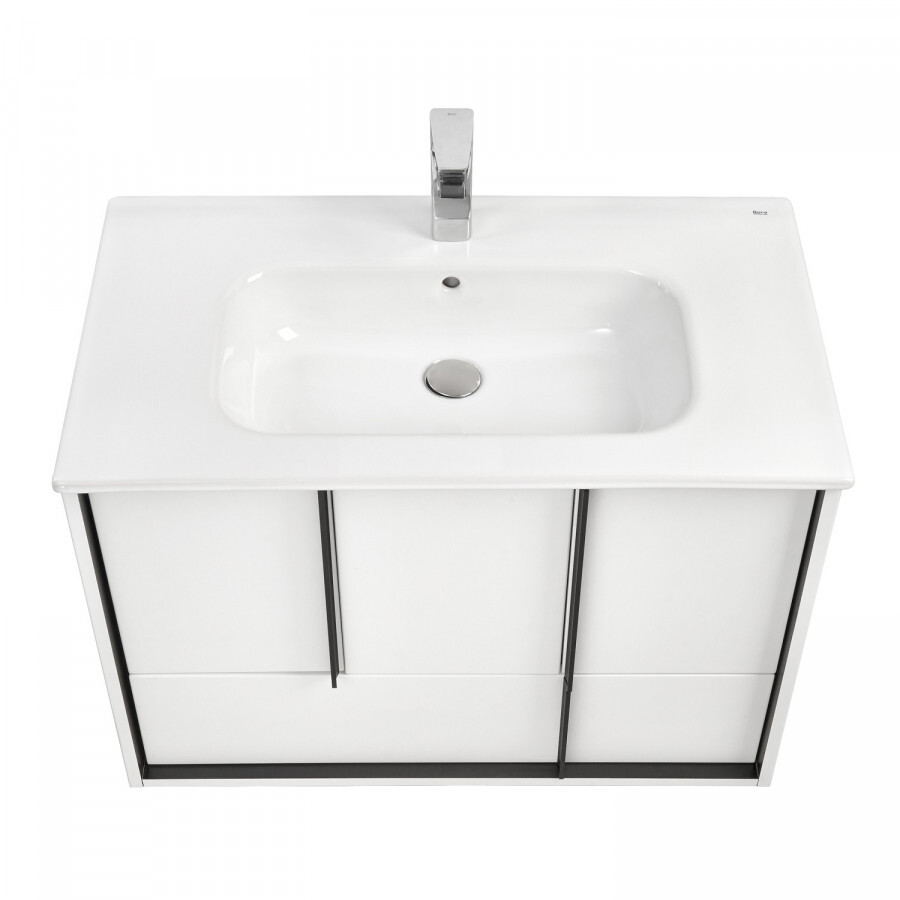 Эффектное классическое сочетание чёрного и белого — лаконичная и всегда беспроигрышная комбинация. Тумба Ривьера 80 выполнена из МДФ чёрного цвета и покрыта белой матовой пленкой, что позволяет создать яркий контраст. Пленка позволяет надежно защитить мебель от воздействия влажной среды ванной комнаты. Центральный ящик тумбы оснащен системой push-to-open, слева и справа за распашными фасадами удобные ниши и вместительный нижний ящик позволит удобно расположить косметические и моющие средства. Необычные чёрные матовые ручки комфортны в использовании и подчеркивают чёткую геометрию линий. Комфорт при использовании обеспечивают надежные петли с доводчиками и направляющие с системой плавного закрывания. Дополнит комплект керамическая раковина Victoria Unik от бренда Roca.