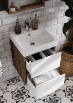 Тумба Сканди 45 выполнена в популярном минималистичном скандинавском стиле. Корпус тумбы выполнен из влагостойкой ЛДСП в декоре натурального дерева, а фасады в белой глянцевой покраске. Конструктивно тумба состоит из 2 вместительных ящиков, установленных на направляющие с интегрированной системой push-to-open для комфортного использования. На тумбе нет выступающих деталей и фурнитуры, открытие ящиков реализовано нажатием на фасад.