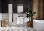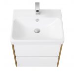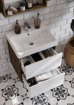 Тумба Сканди 55 выполнена в популярном минималистичном скандинавском стиле. Корпус тумбы выполнен из влагостойкой ЛДСП в декоре натурального дерева, а фасады в белой глянцевой покраске. Конструктивно тумба состоит из 2 вместительных ящиков, установленных на направляющие с интегрированной системой push-to-open для комфортного использования. На тумбе нет выступающих деталей и фурнитуры, открытие ящиков реализовано нажатием на фасад. Тумба комплектуется белоснежной раковиной Адриана от бренда Santek. Раковина приобретается отдельно.