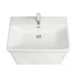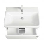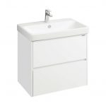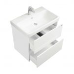 Тумба Сканди 70 выполнена в популярном минималистичном скандинавском стиле. Корпус тумбы выполнен из влагостойкой ЛДСП в белой матовой покраске, а фасады в белой глянцевой покраске. Конструктивно тумба состоит из 2 вместительных ящиков, установленных на направляющие с интегрированной системой push-to-open для комфортного использования. На тумбе нет выступающих деталей и фурнитуры, открытие ящиков реализовано нажатием на фасад. Тумба комплектуется белоснежной раковиной Адриана от бренда Santek. Раковина приобретается отдельно. Тумбу по желанию можно использовать в двух вариантах: как подвесную или дополнительно приобрести опоры