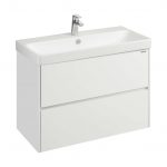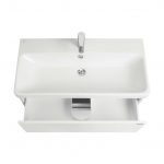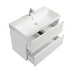 Тумба Сканди 90 выполнена в популярном минималистичном скандинавском стиле. Корпус тумбы выполнен из влагостойкой ЛДСП в белой матовой покраске, а фасады в белой глянцевой покраске. Конструктивно тумба состоит из 2 вместительных ящиков, установленных на направляющие с интегрированной системой push-to-open для комфортного использования. На тумбе нет выступающих деталей и фурнитуры, открытие ящиков реализовано нажатием на фасад. К тумбе отлично подходит удобная современная керамическая раковина Адриана от бренда Santek. Тумбу по желанию можно использовать в двух вариантах: как подвесную или дополнительно приобрести опоры