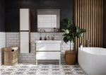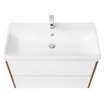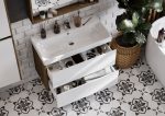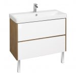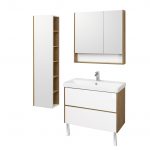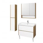 Тумба Сканди 90 выполнена в популярном минималистичном скандинавском стиле. Корпус тумбы выполнен из влагостойкой ЛДСП в декоре натурального дерева, а фасады в белой глянцевой покраске. Конструктивно тумба состоит из 2 вместительных ящиков, установленных на направляющие с интегрированной системой push-to-open для комфортного использования. На тумбе нет выступающих деталей и фурнитуры, открытие ящиков реализовано нажатием на фасад. Тумба комплектуется белоснежной раковиной Адриана от бренда Santek. Раковина приобретается отдельно. Тумбу по желанию можно использовать в двух вариантах: как подвесную или дополнительно приобрести опоры