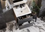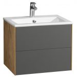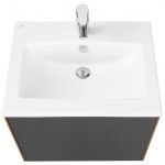 Тумба Сохо 60 функционально состоит из двух вместительных ящиков, оснащенных системой push to open, обеспечивающей надежное, комфортное и бесшумное закрывание. Фасады изделия выполнены из МДФ в пленке графит с эффектом soft touch, корпус из ламинированной влагостойкой ДСП Дуб веллингтон. Верхний и нижний ящики позволяют содержать косметические средства в идеальном порядке. Дополняет тумбу стильная раковина Элина от бренда Santek с удобной чашей. Все внутренние детали тумбы выполнены в тон фасадов — цвета антрацит.