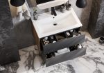 Тумба Сохо 75 функционально состоит из двух вместительных ящиков, оснащенных системой push to open, обеспечивающей надежное, комфортное и бесшумное закрывание. Фасады изделия выполнены из МДФ в пленке в цвете галька серая, корпус из ламинированной влагостойкой ДСП слэйт. Верхний и нижний ящики оснащены системой организации пространства, которая позволяет содержать косметические средства в идеальном порядке. Дополняет тумбу стильная раковина Элина от бренда Santek с удобной чашей. Раковина приобретается отдельно. Все внутренние детали тумбы выполнены в цвете антрацит.