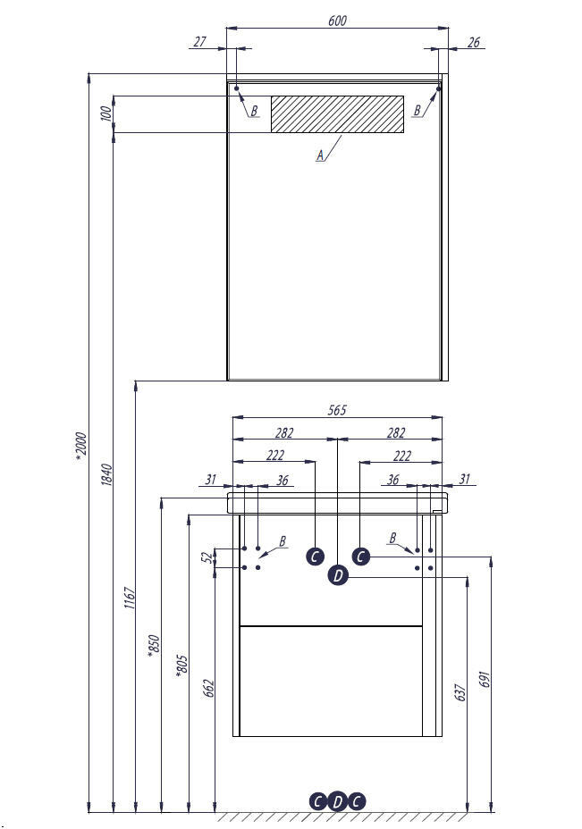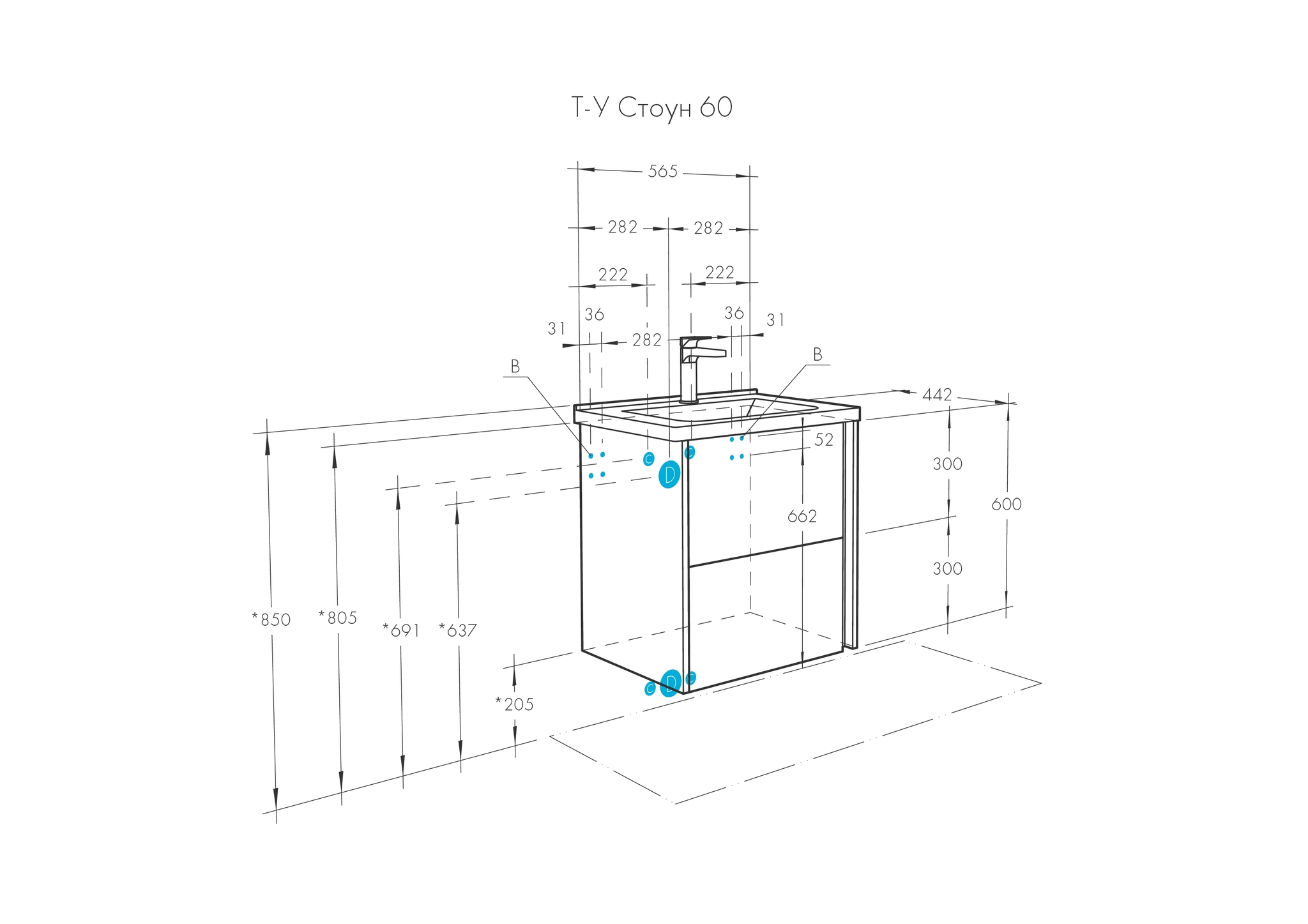 Высота тумбы с раковиной +-5мм(если нет опор)644 мм