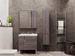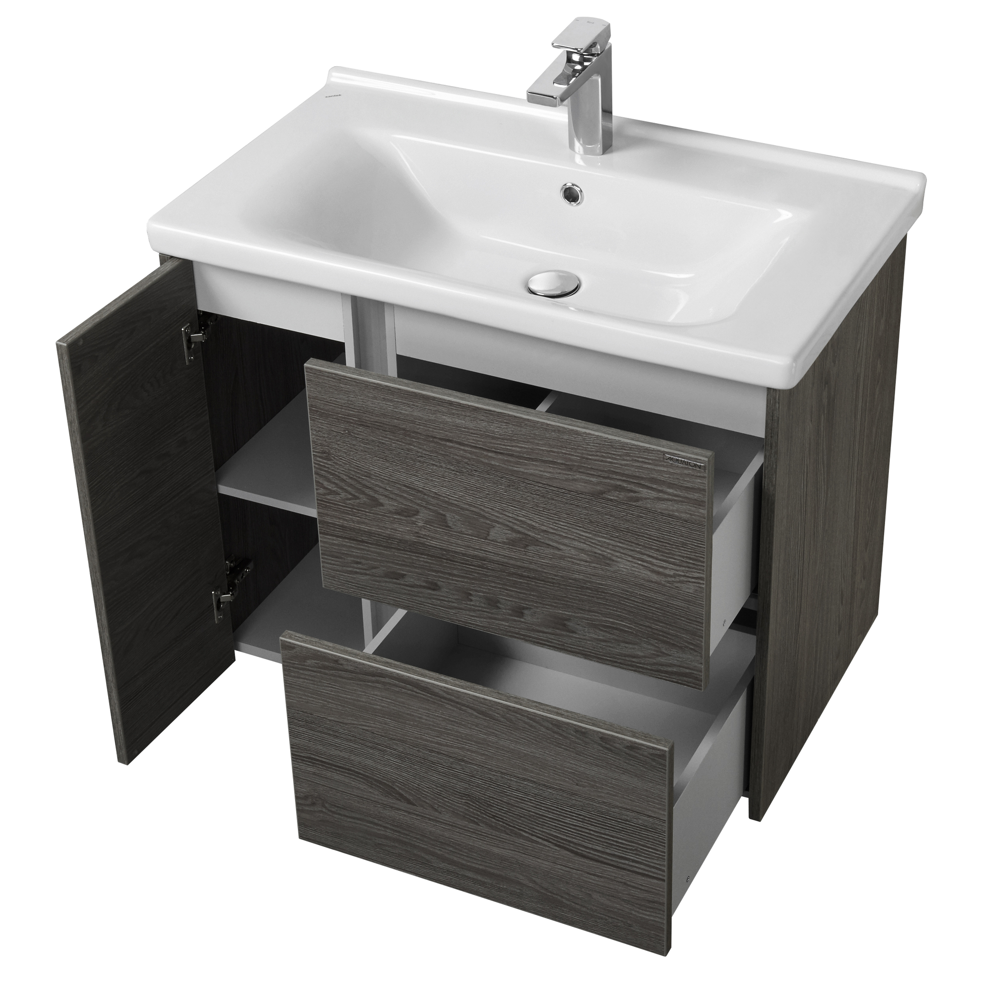 Лаконичная и вместительная тумба Стоун 80 от бренда AQUATON отражает актуальные тенденции в дизайне мебели для ванных комнат. Тумба оборудована двумя удобными выдвижными ящиками, слева от которых за распашным фасадом-створкой находится дополнительный отсек для хранения. Дверца закрывается мягко и бесшумно благодаря петлям с доводчиками, а ящики оснащены системой плавного закрывания, что обеспечивает комфорт при использовании. Корпус и фасады тумбы выполнены из влагостойкой ЛДСП в эффектной декоративной отделке грецкий орех, имитирующей древесную текстуру.