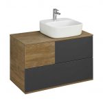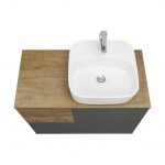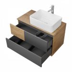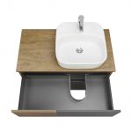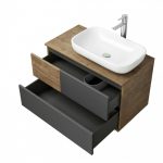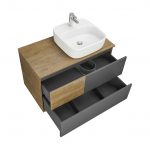 Мебель коллекции Терра сочетает в себе стильные оттенки: дуб кантри и антрацит. Тумба Терра 85 состоит из двух вместительных ящиков, открывающихся с помощью системы push-to-open, нижний ящик комплектуется системой организации пространства, которая препятствует смещению мелких косметических и гигиенических средств. Фасады ящиков — матовая серая пленка антрацит, а столешница, корпус и вставка на верхнем ящике — влагостойкое ДСП с текстурой дуб кантри.